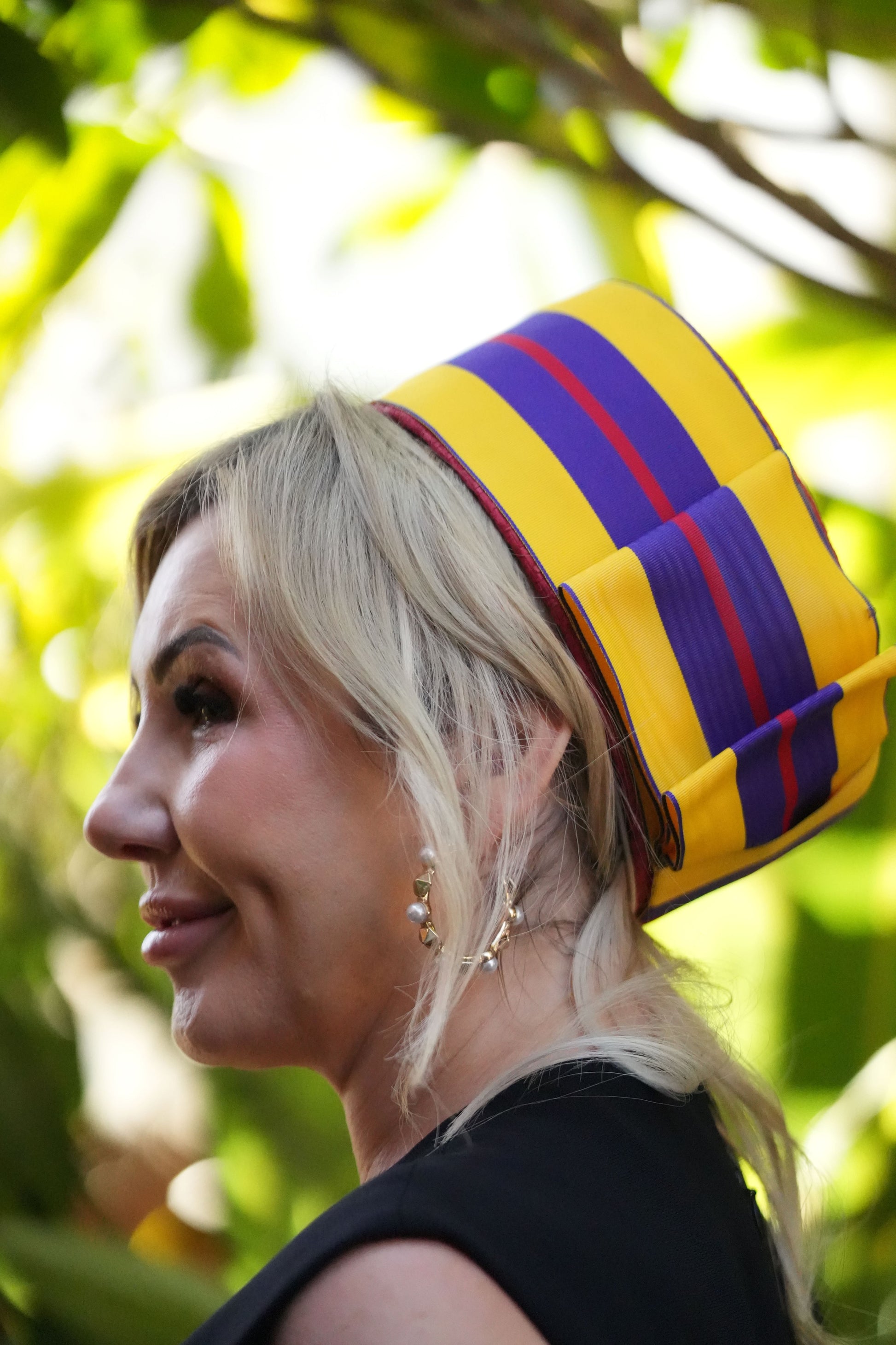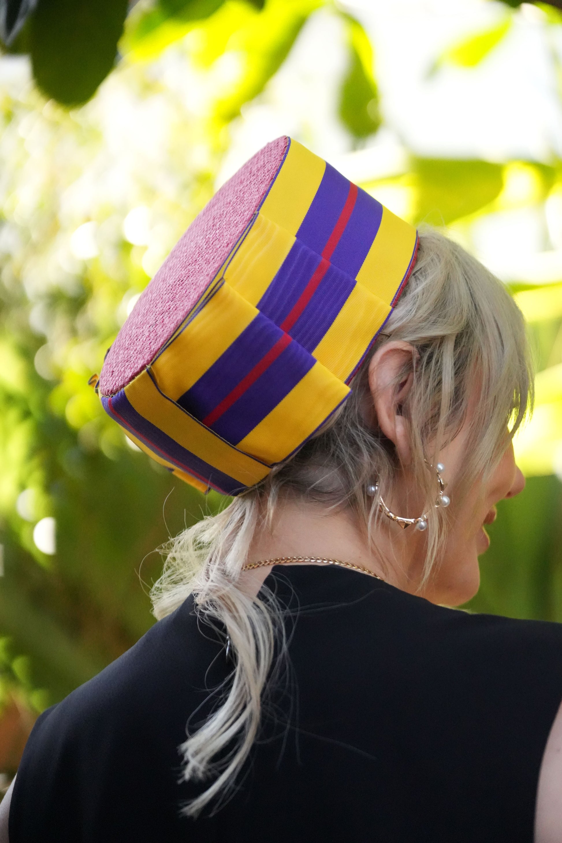 Alfreda is a Red Straw Pillbox, trimmed with 4inch wide Grosgrain Ribbon, in Yellow Purple and Red. You will not be missed wearing Alfreda.