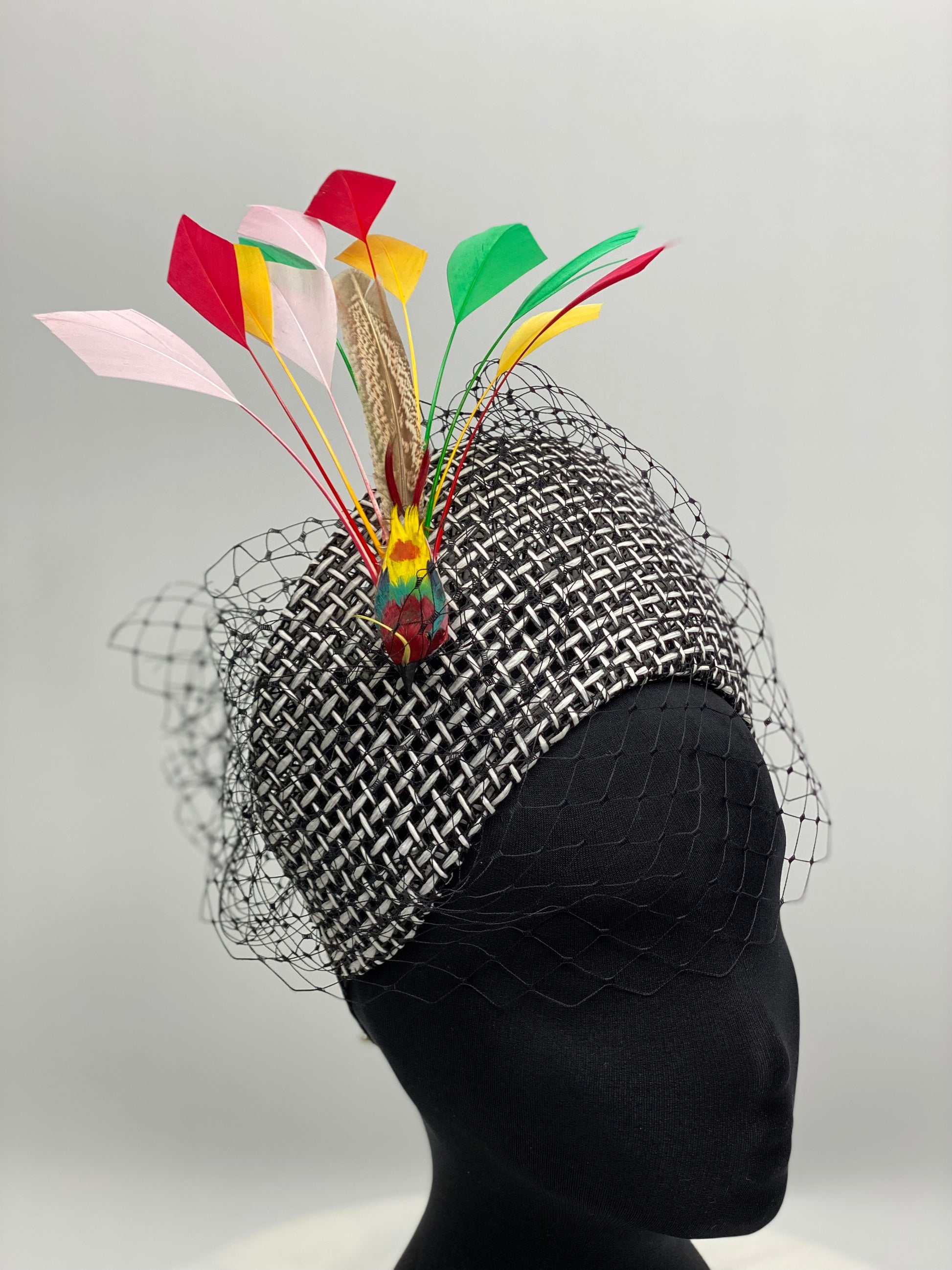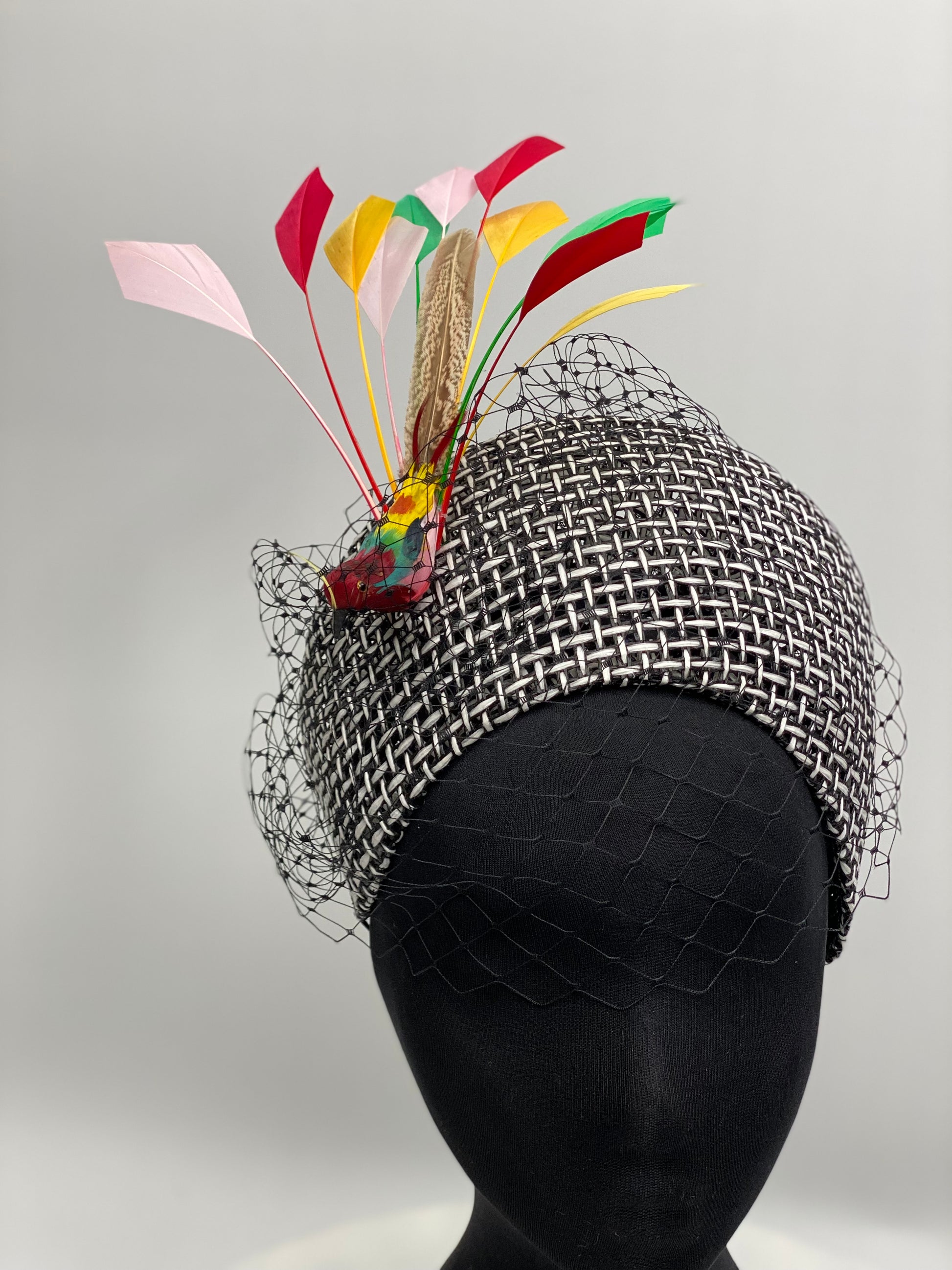 Anastasia is Black and White Straw Crown with a Vintage Feather Bird Trim. The Black Veiling adds a sense of drama, or is detachable for those occasions when you feel like a change.