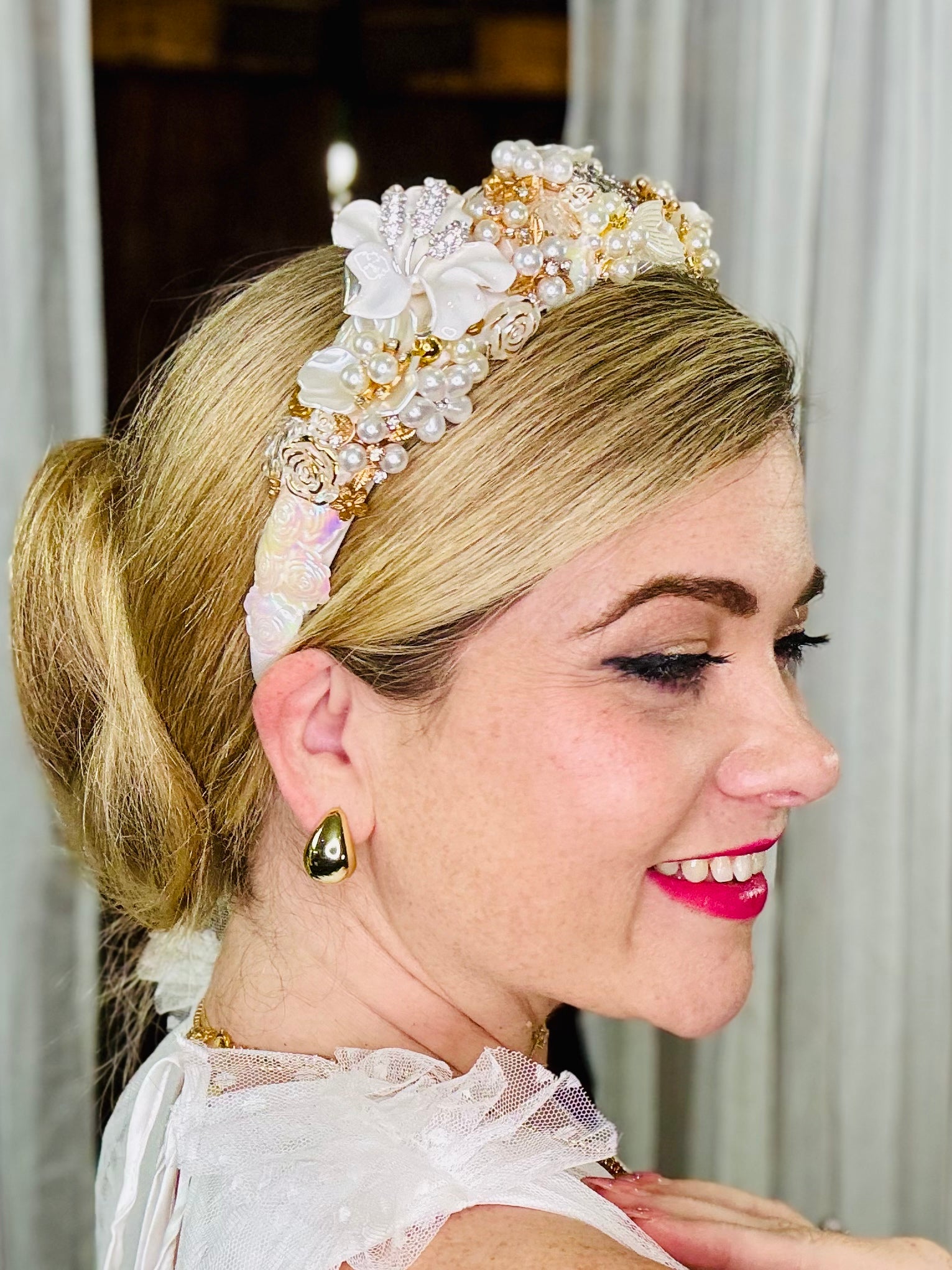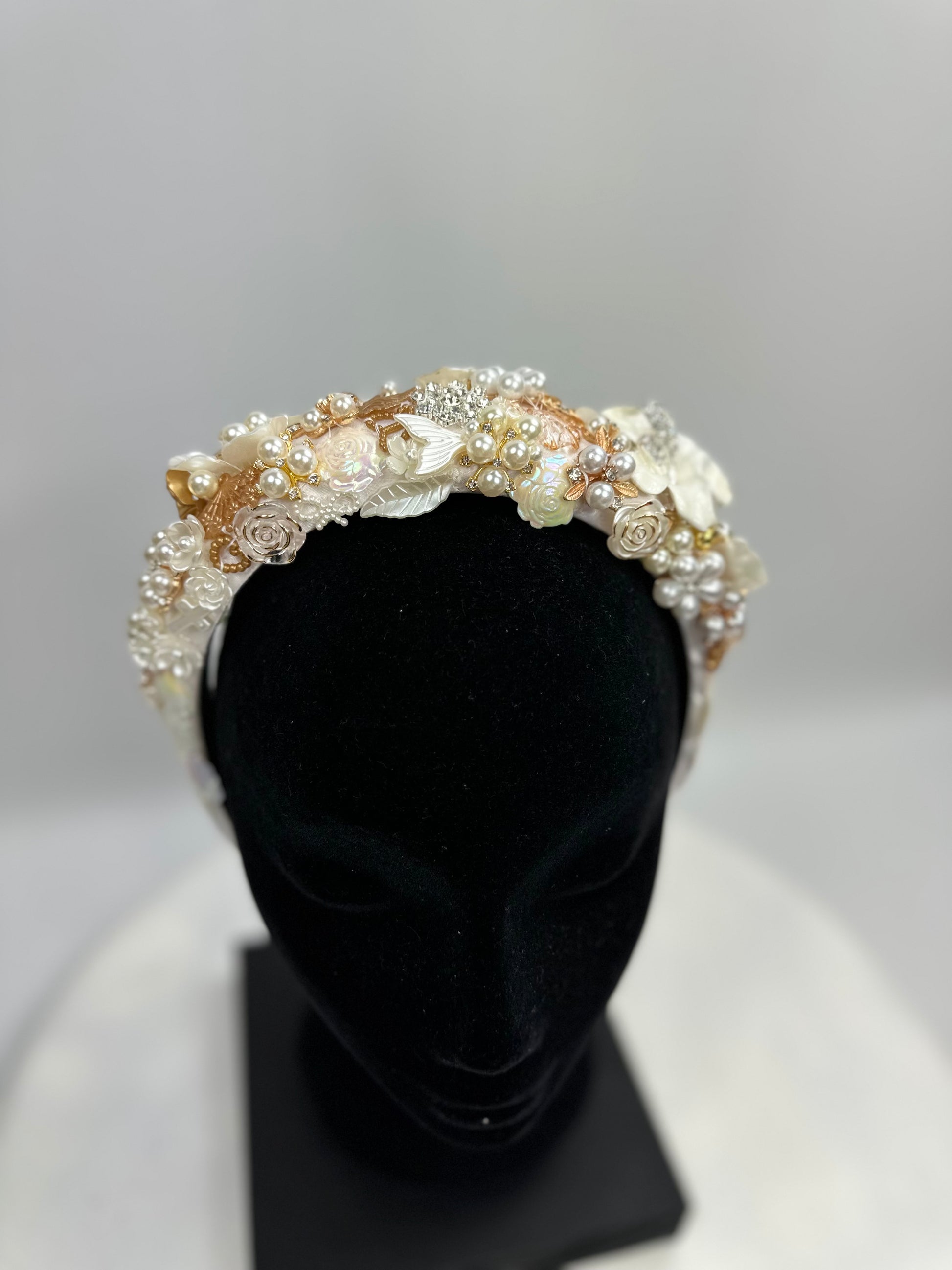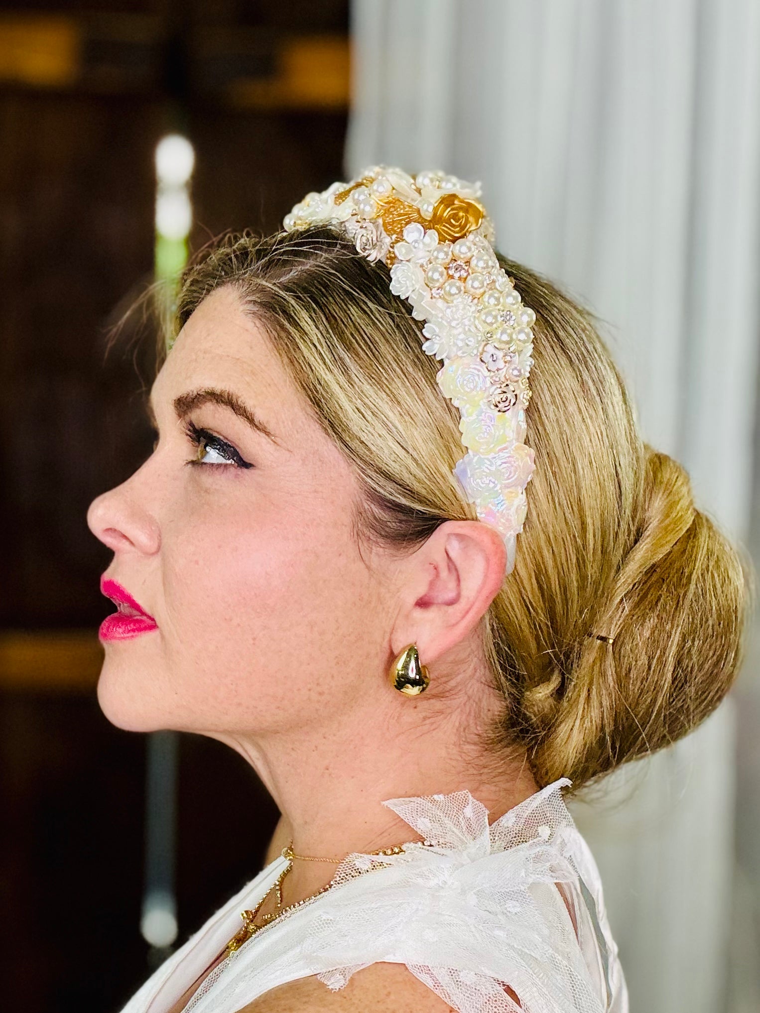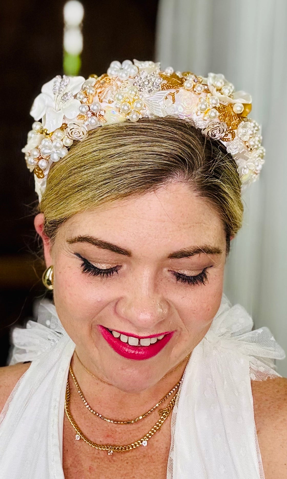 Annice is a Beautifully Handbeaded Headband in White and Gold. She would be a Perfect Wedding Headpiece or Fit in at any other Occasion.
