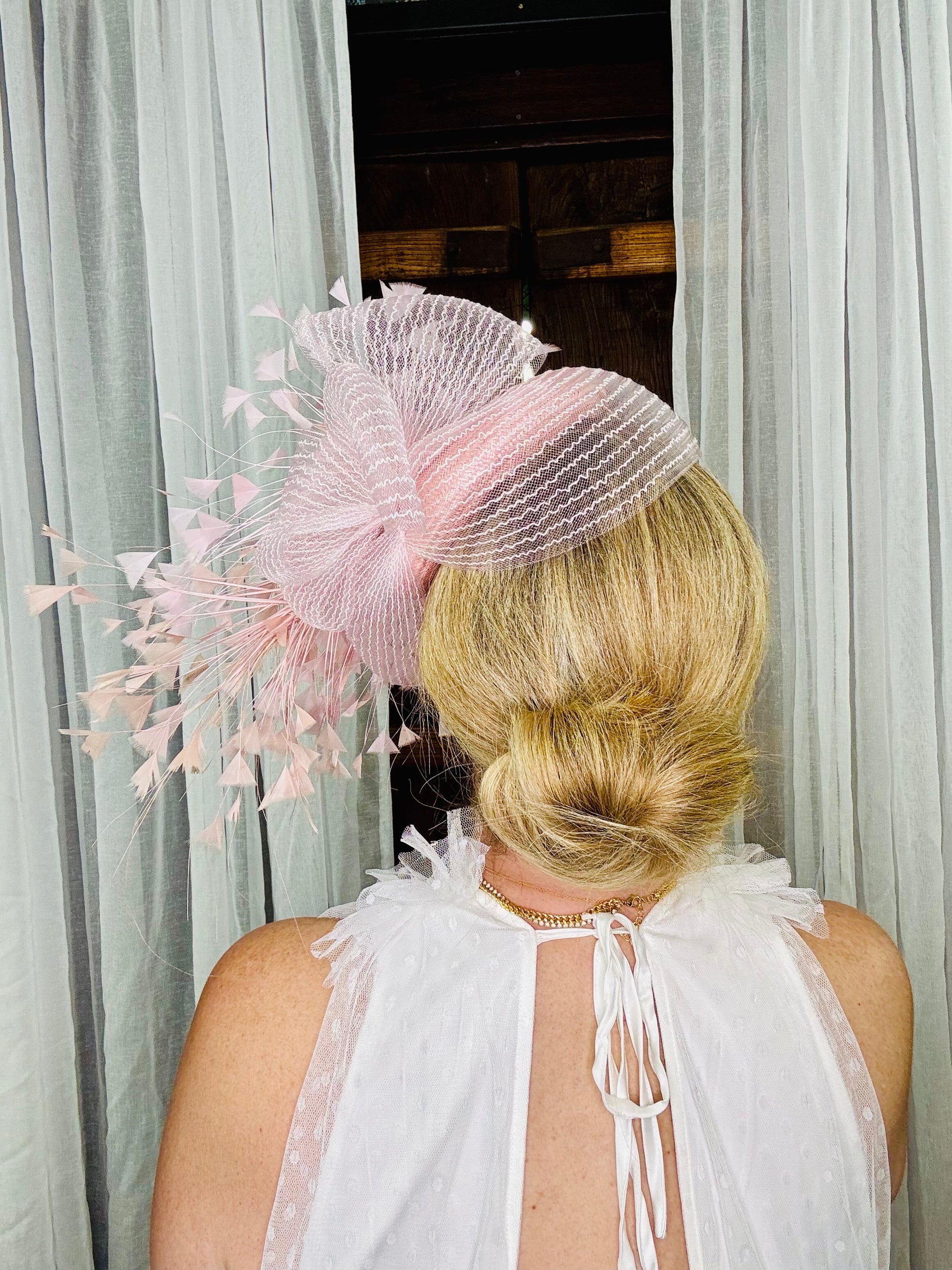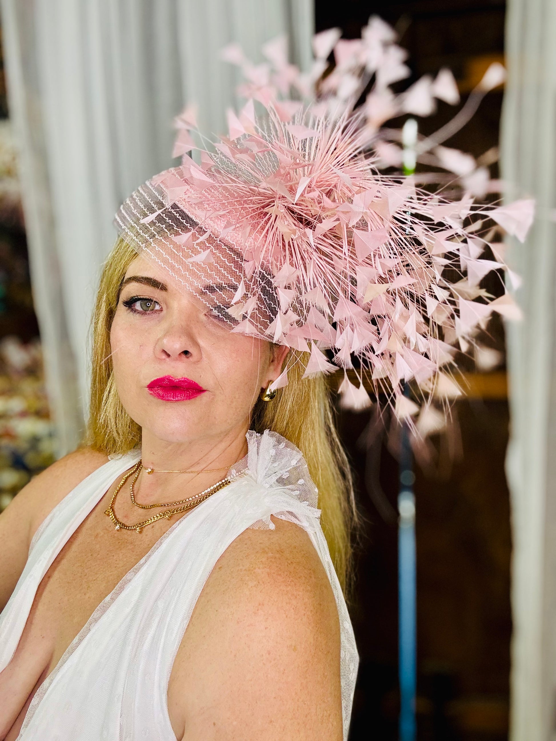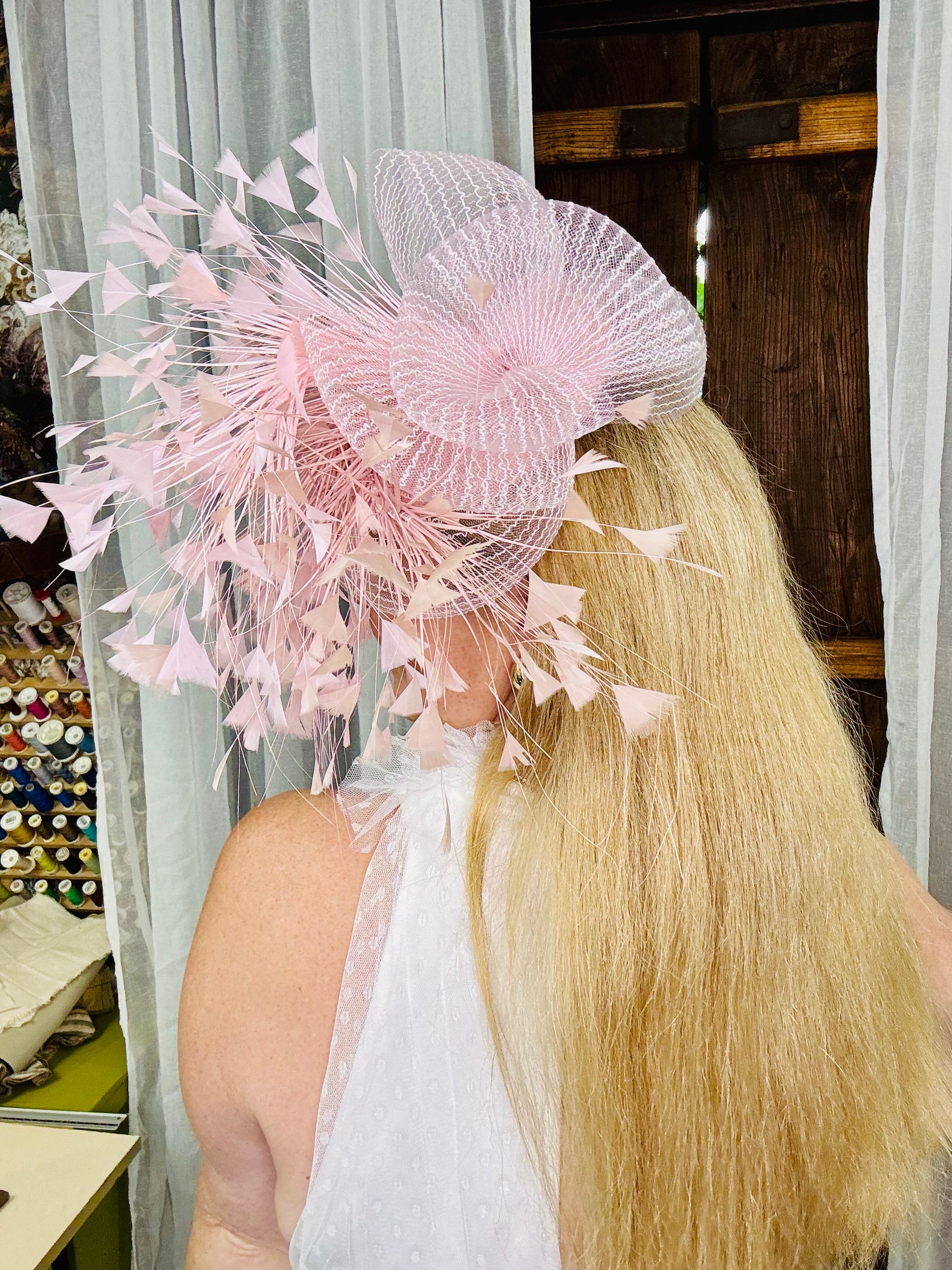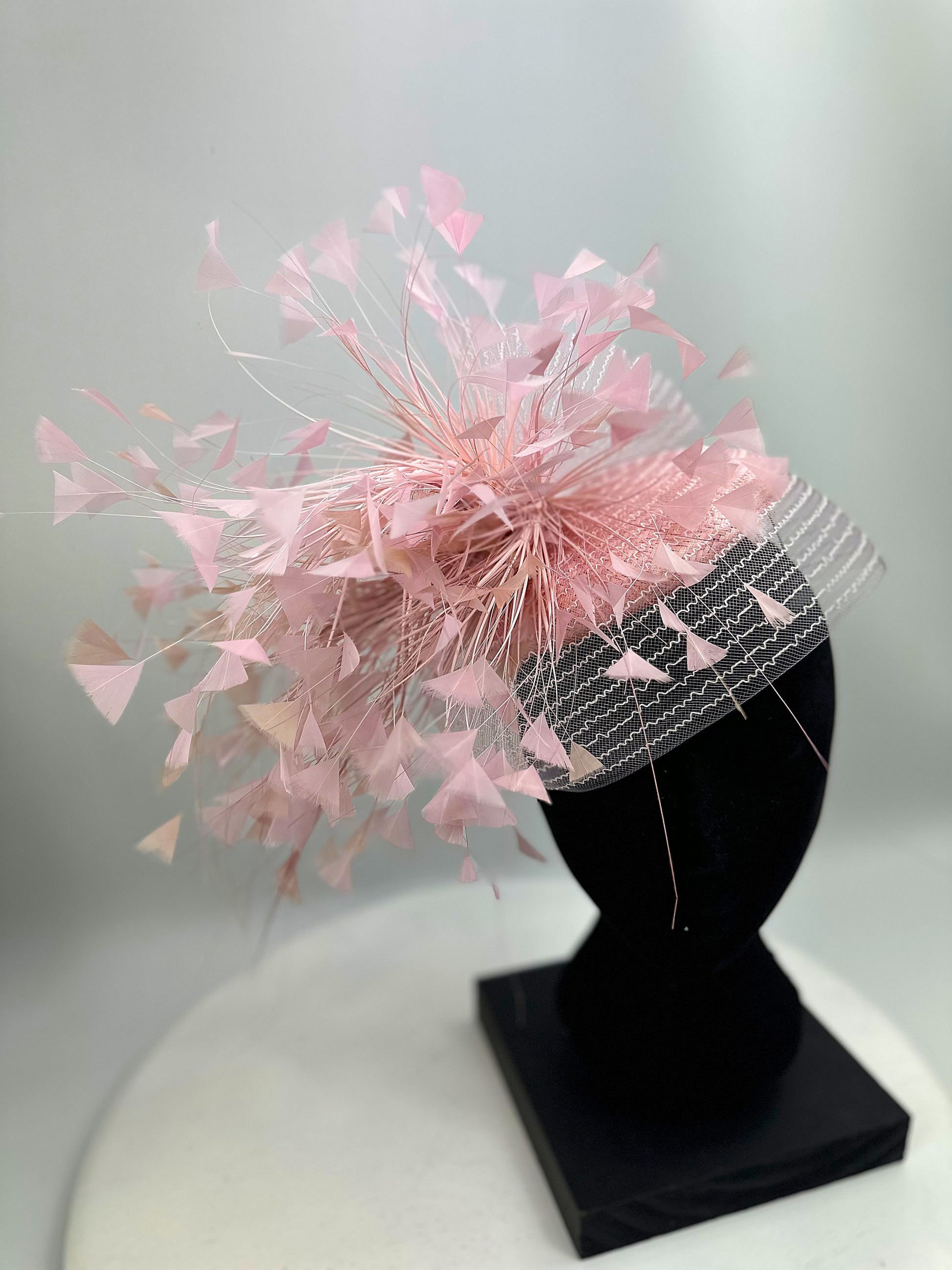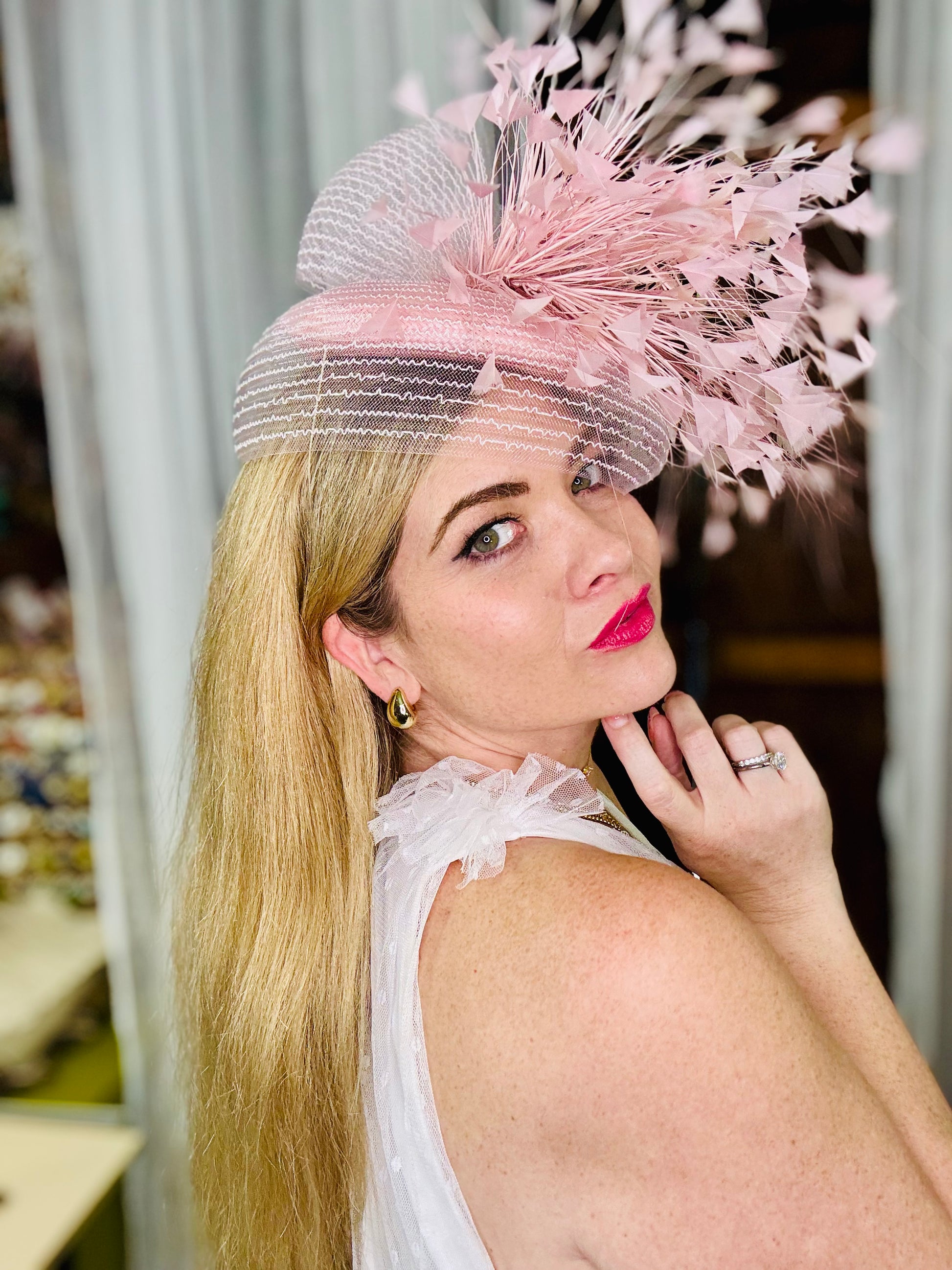 Ava is a Pink Straw Button Style Hat with Crinoline Veiling and Pink Feathers