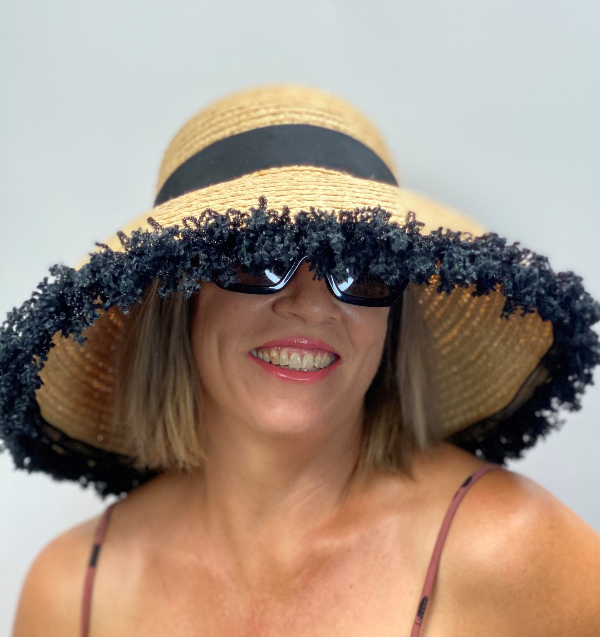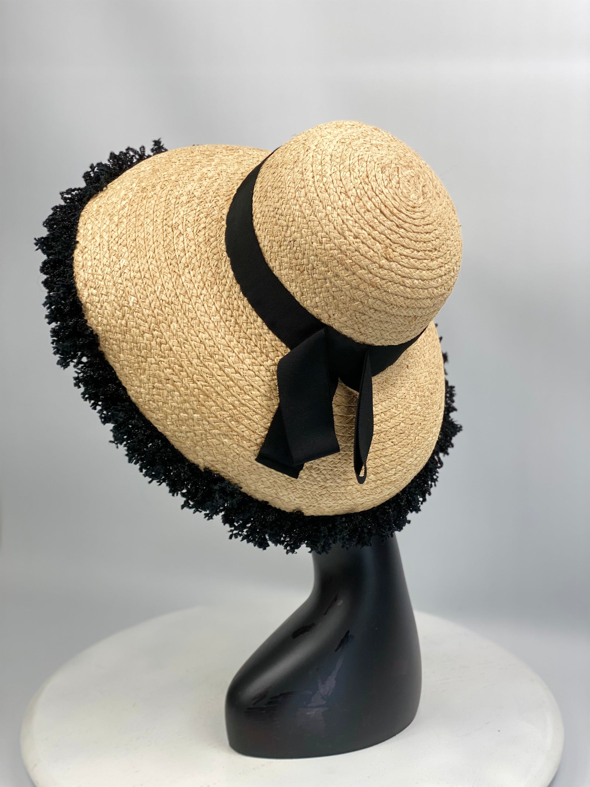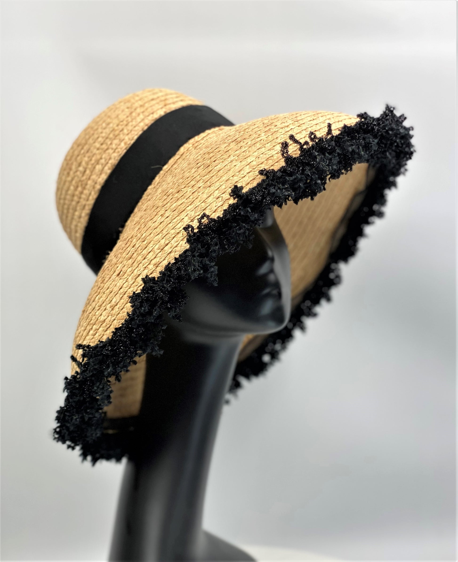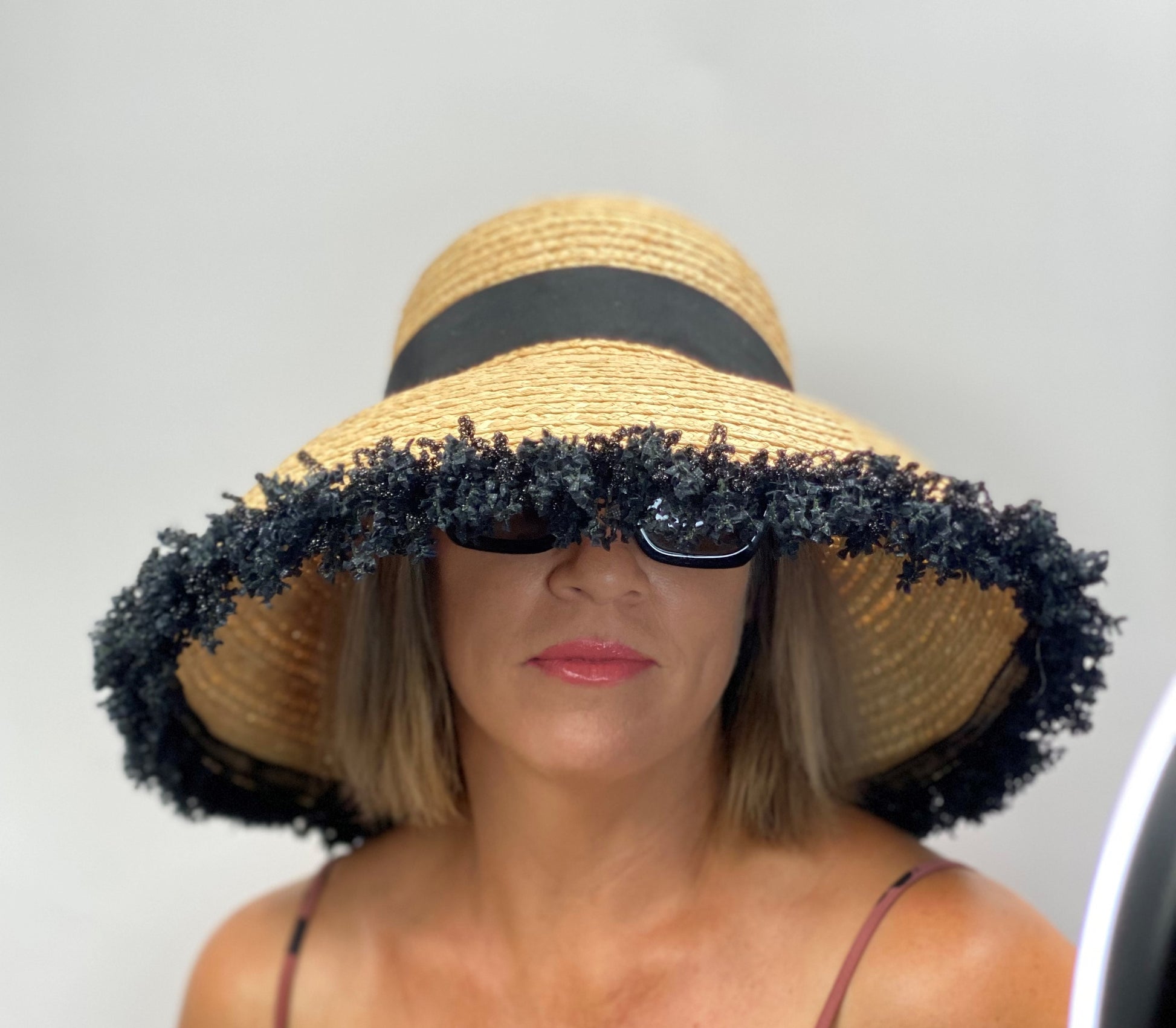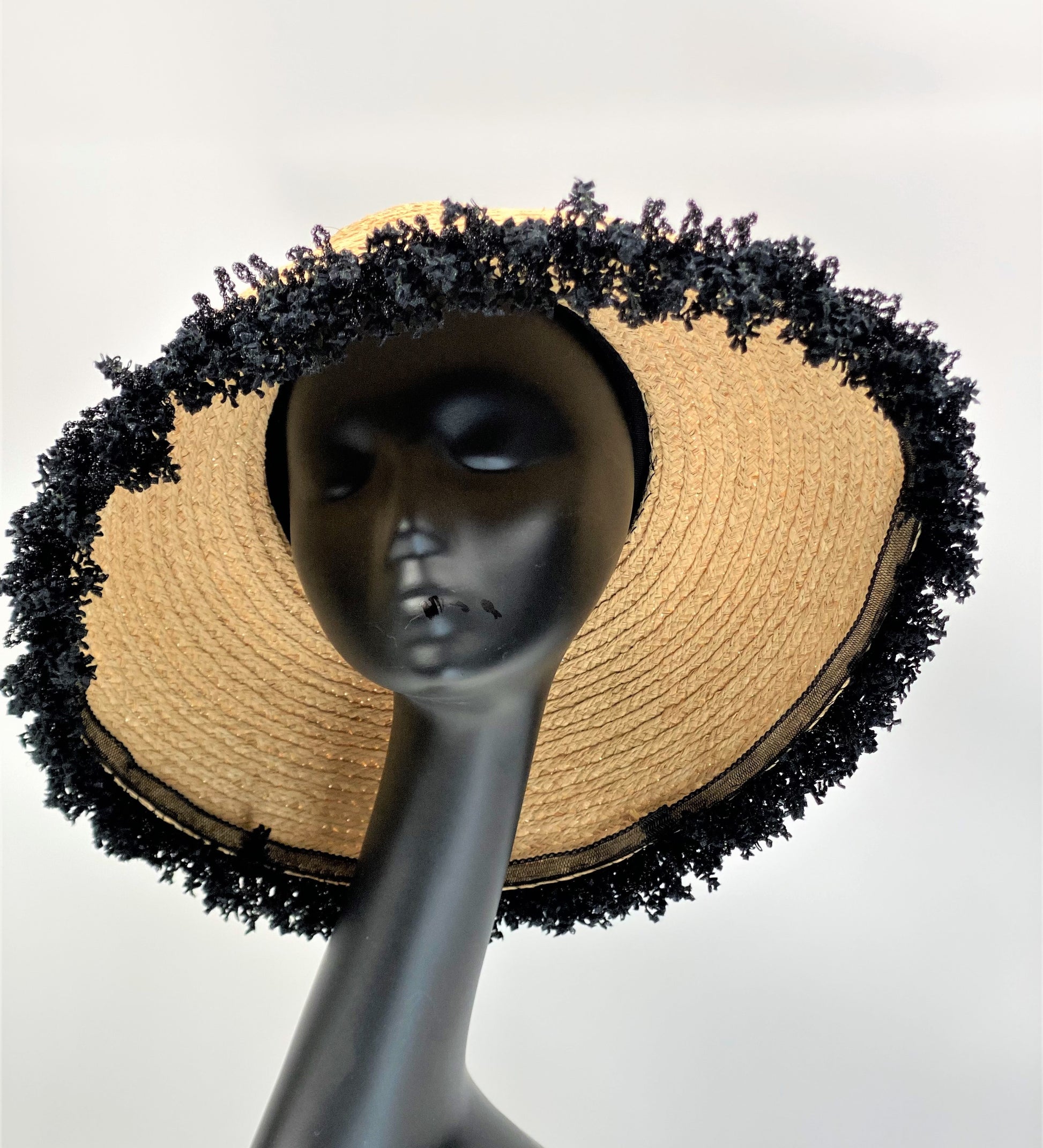 Becky is a Natural Straw Sun Hat with Wide Dior Brim. Trimmed with Black Fringe and a Black Grosgrain Band. Very Stylish and Great for Sun protection, large fit.