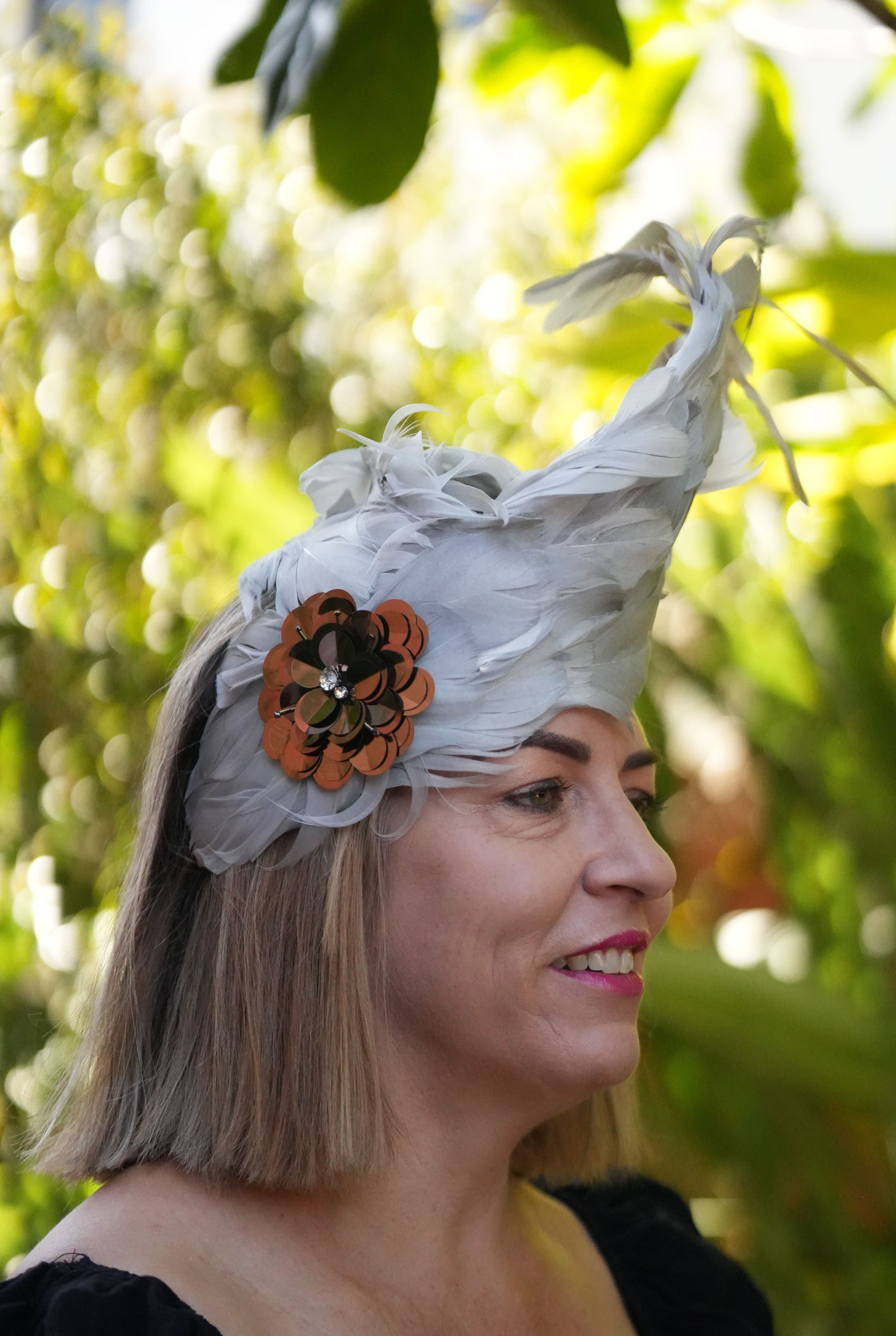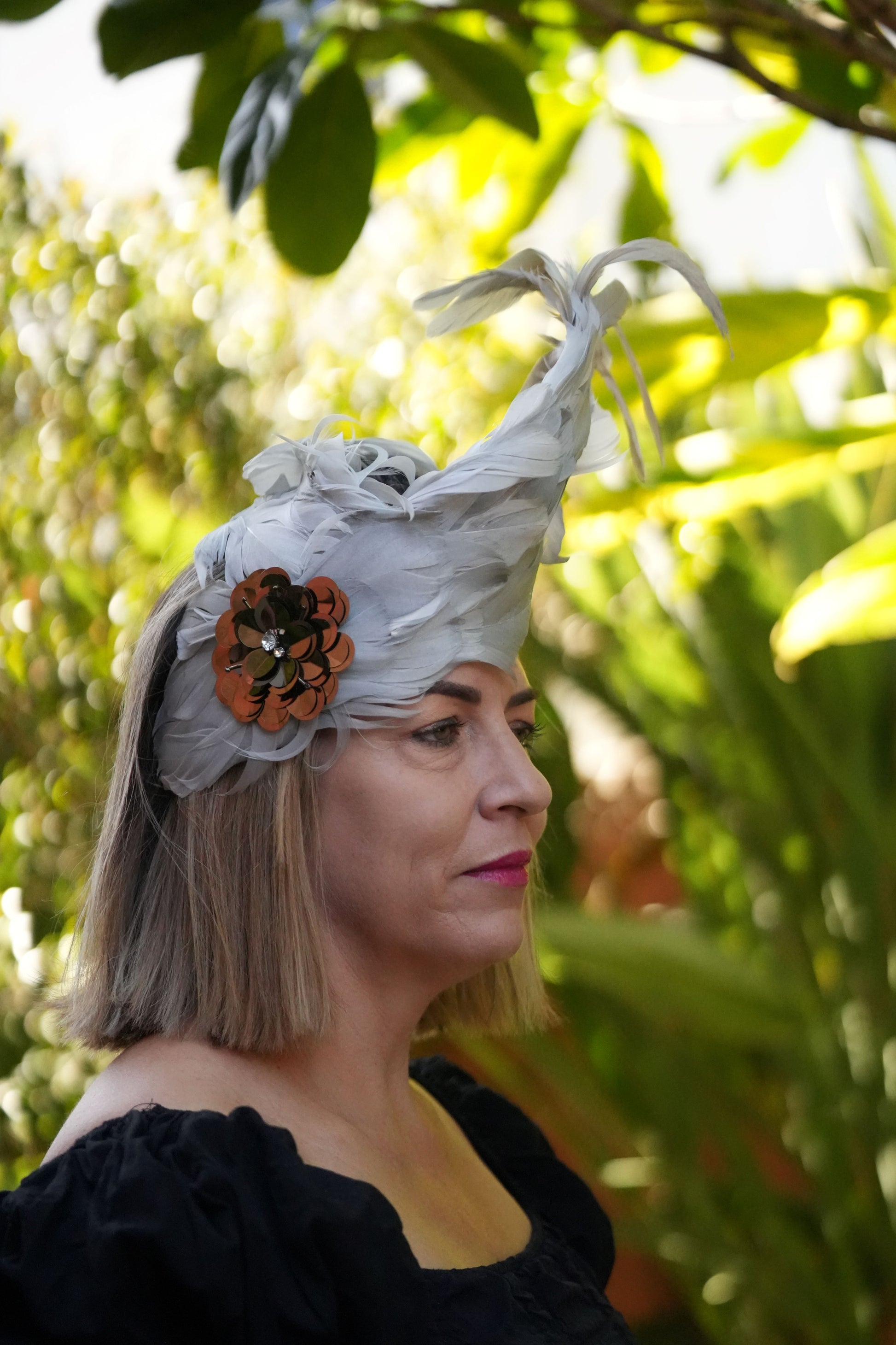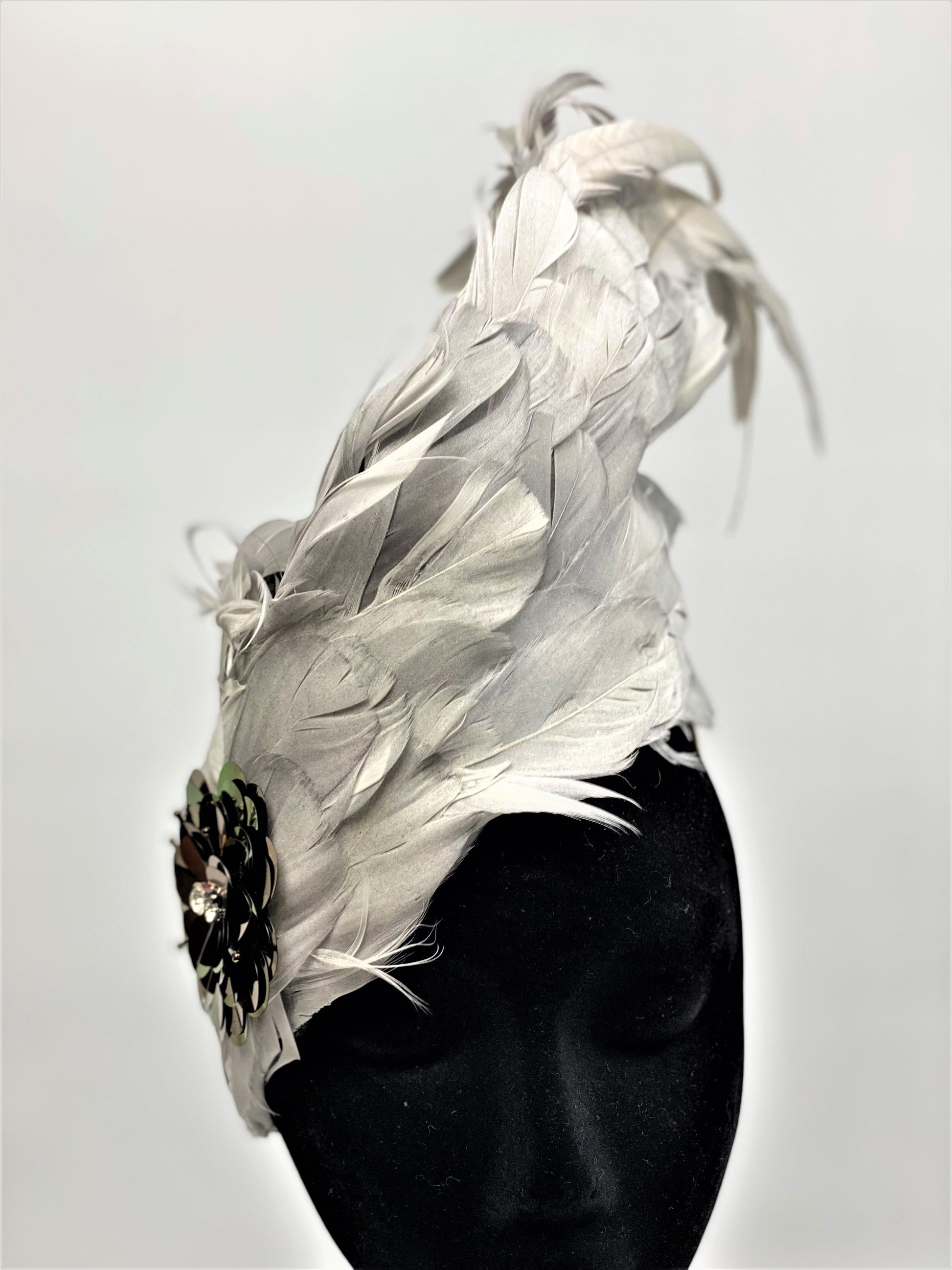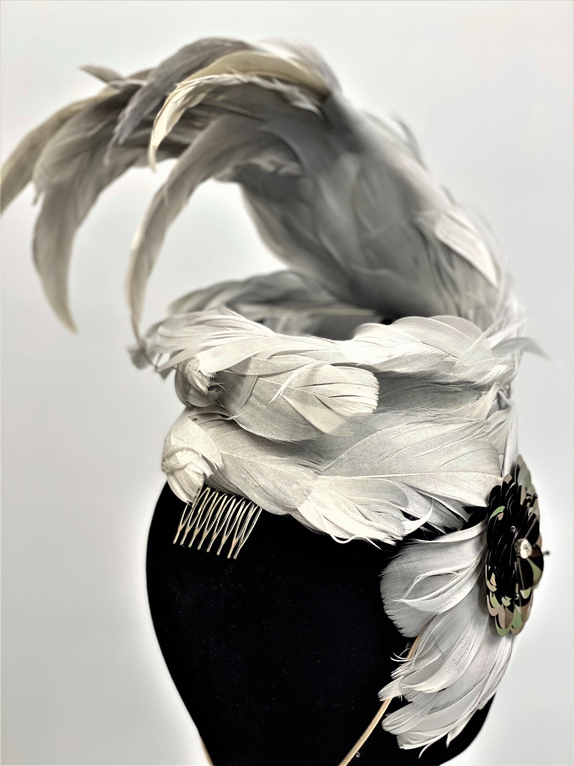 Bertha is a Feather Fascinator with a difference. Silver /Grey Feathers 'in a twist', sitting to the side of the head, creating a sense of drama. Who doesn't like a bit of drama!