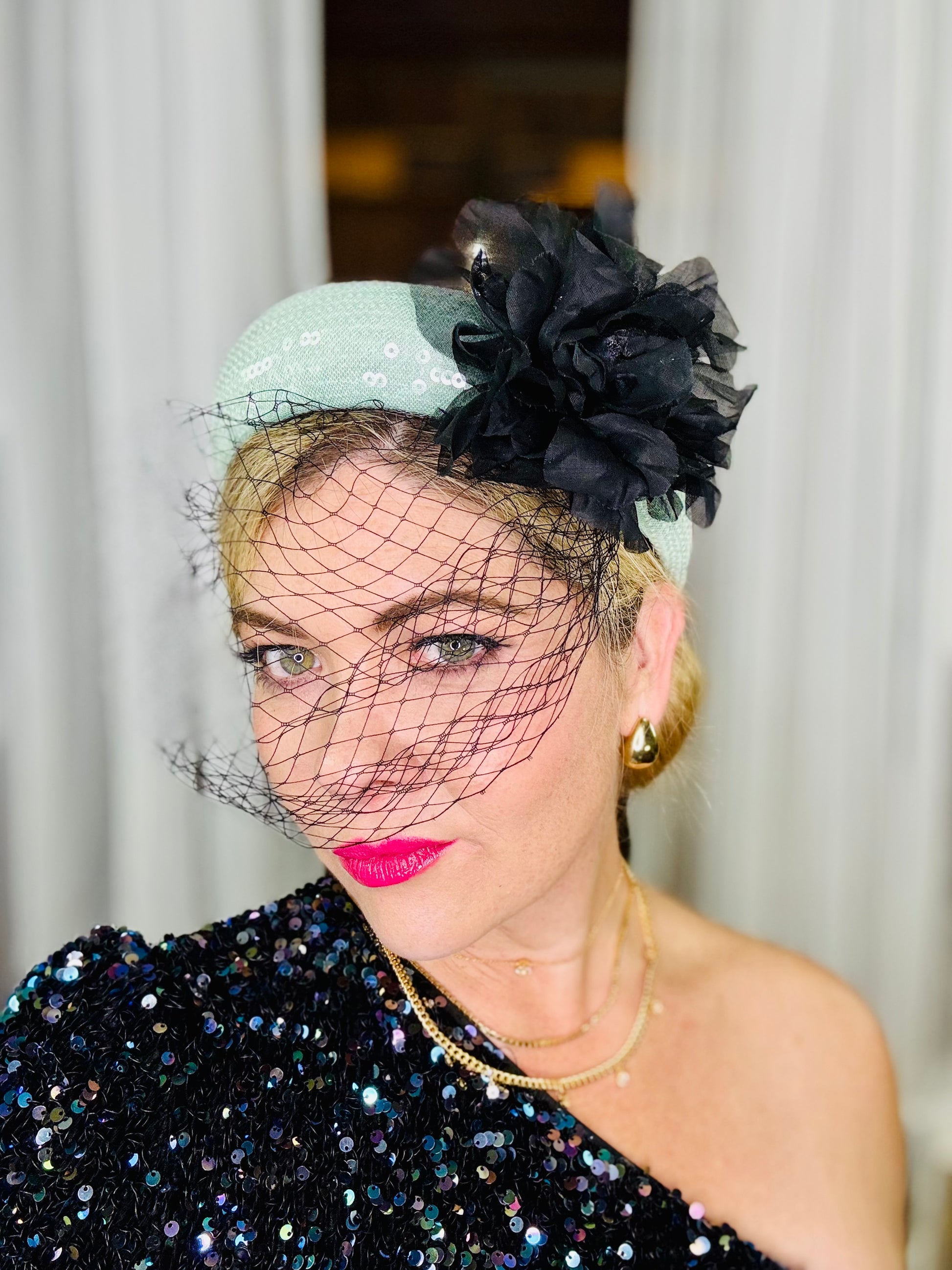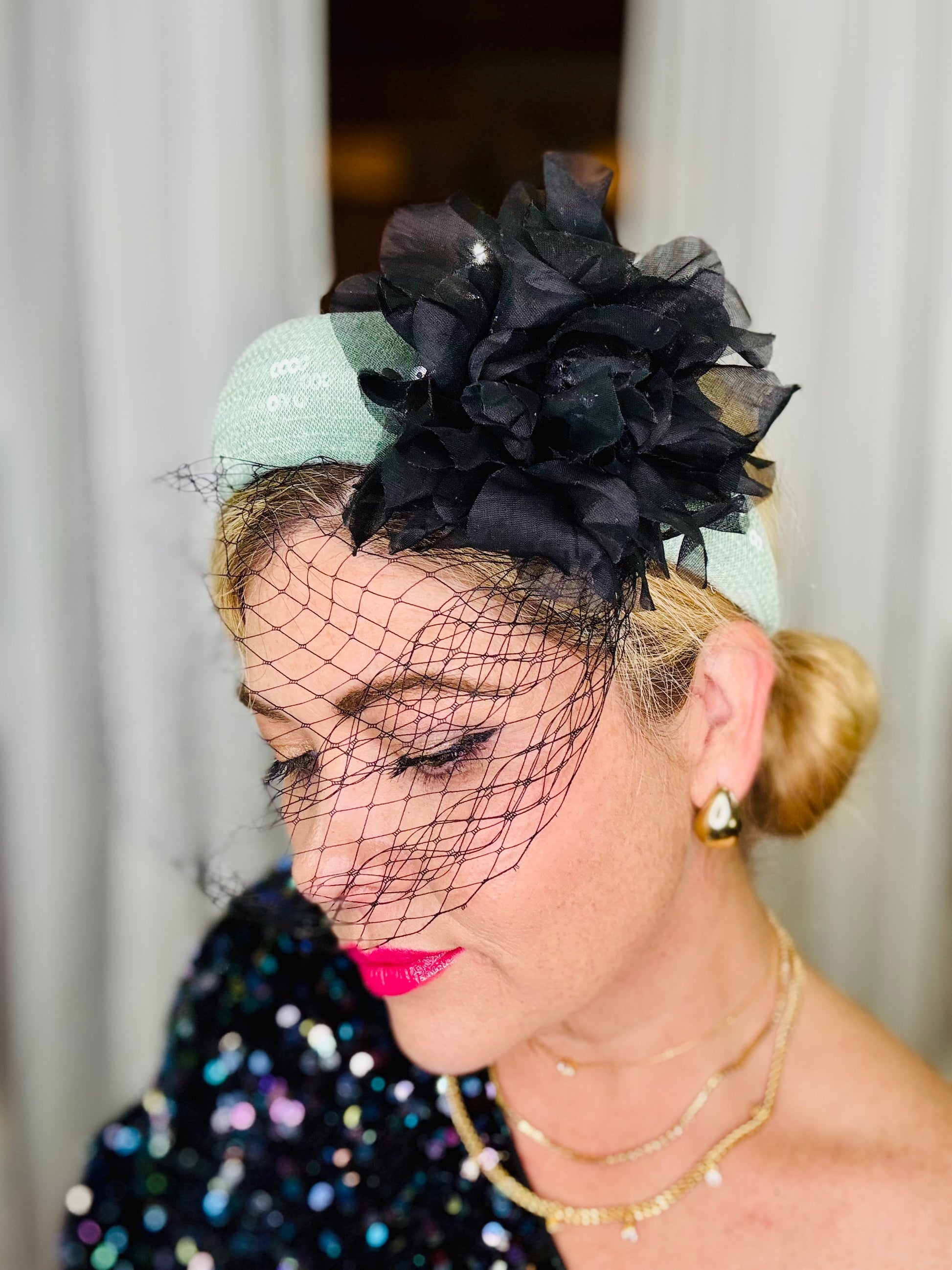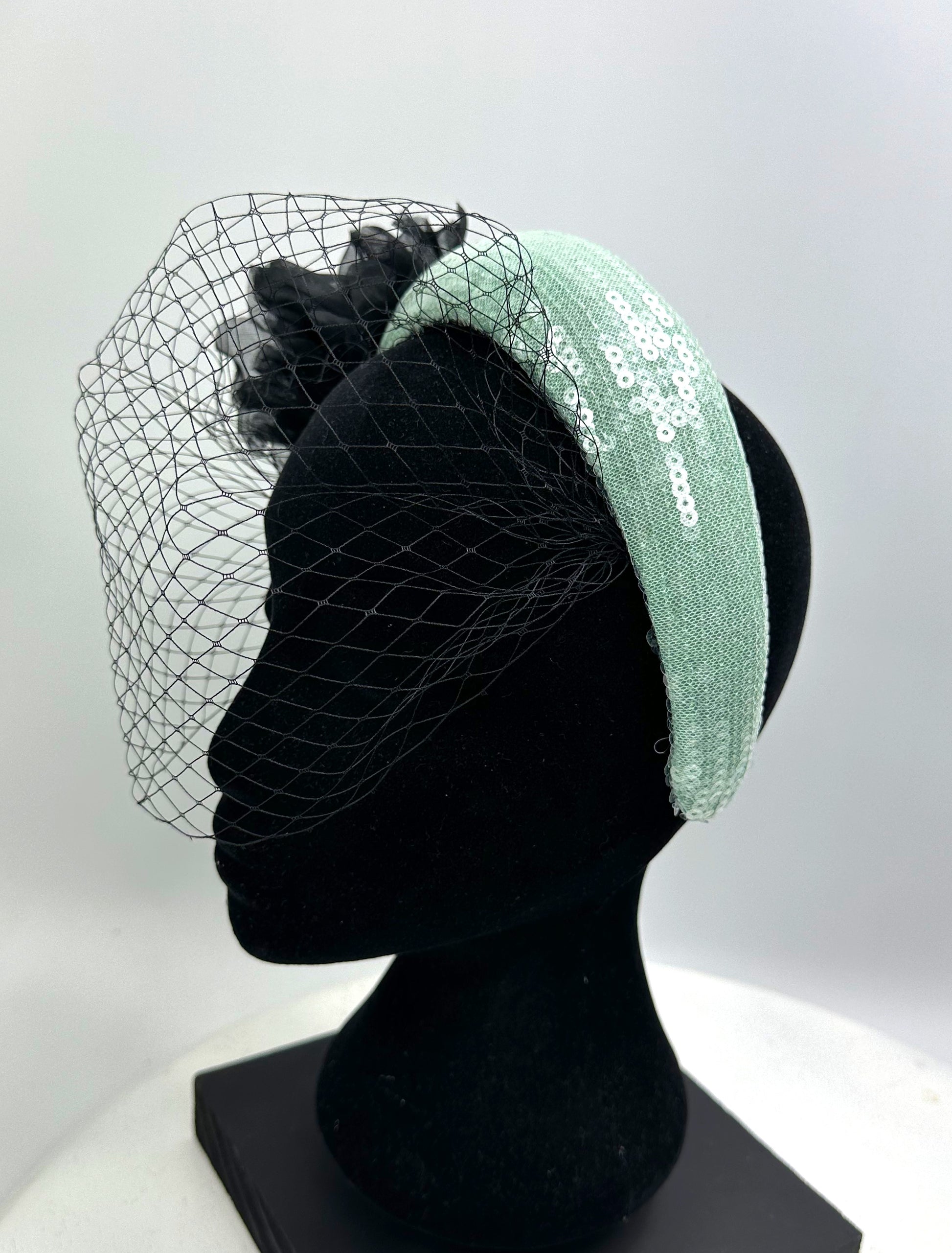 EDDIE is a Mint Green Sequined Headband trimmed with a Handmade Black Organza Flower and Black Veiling.