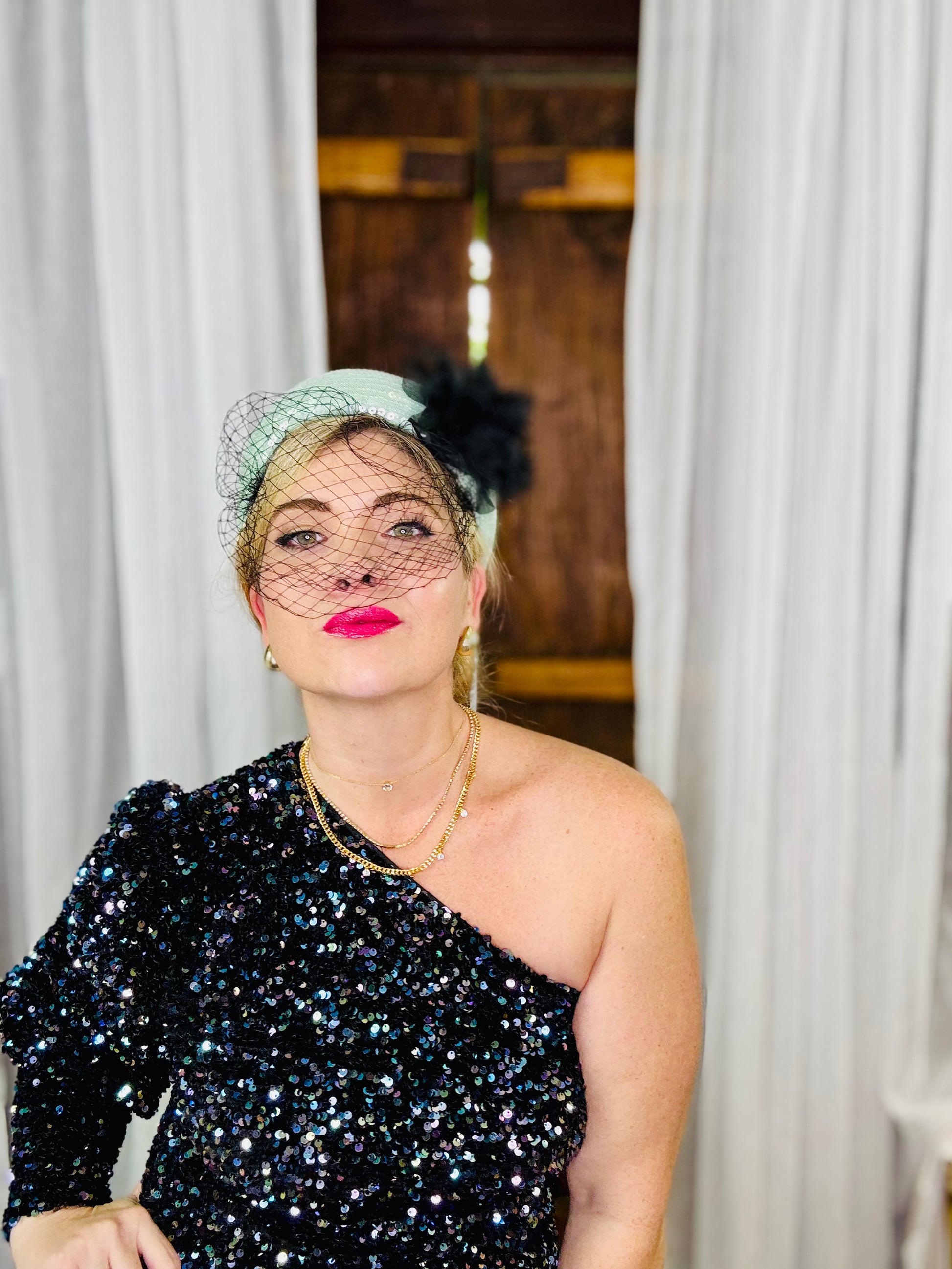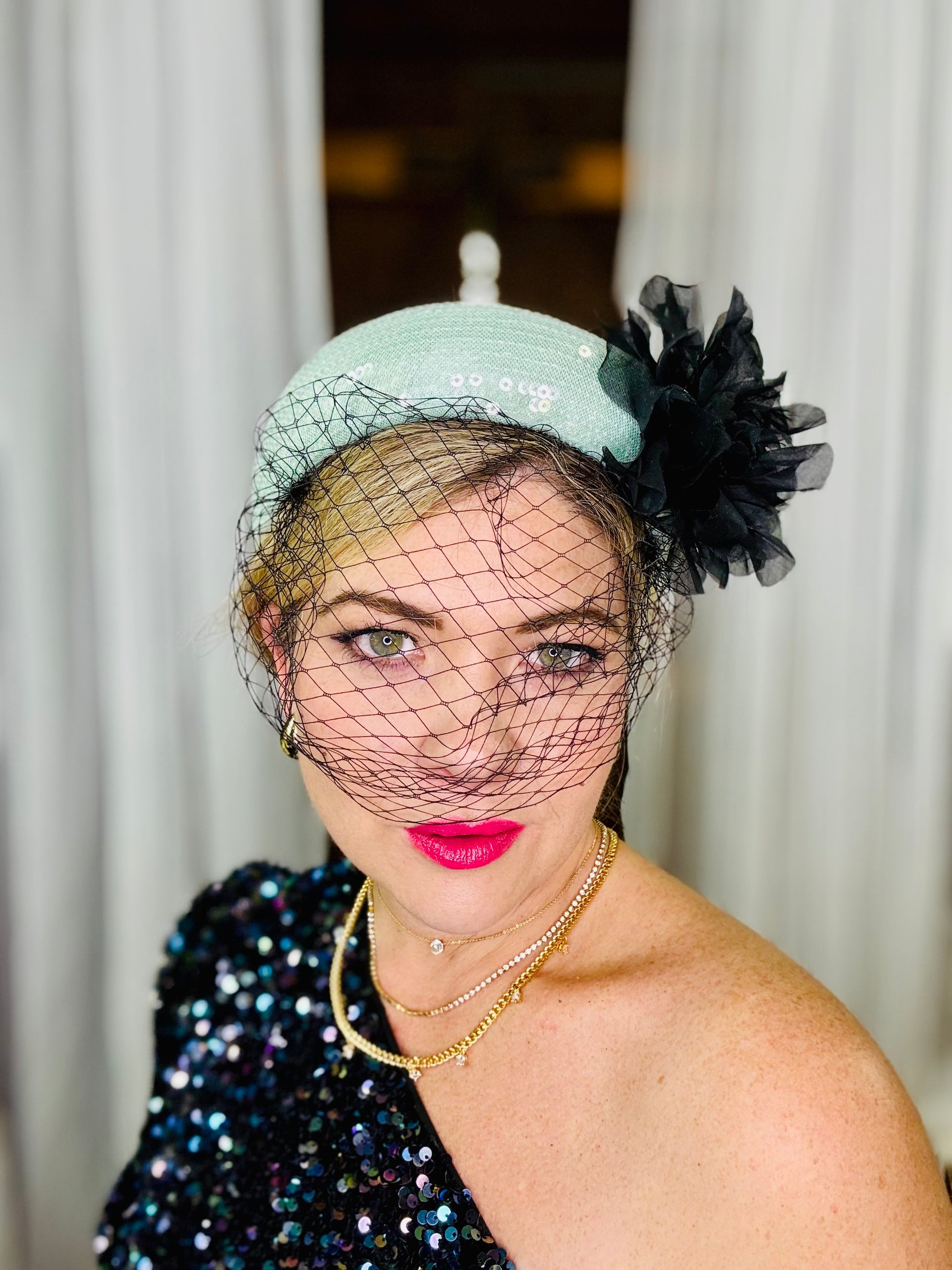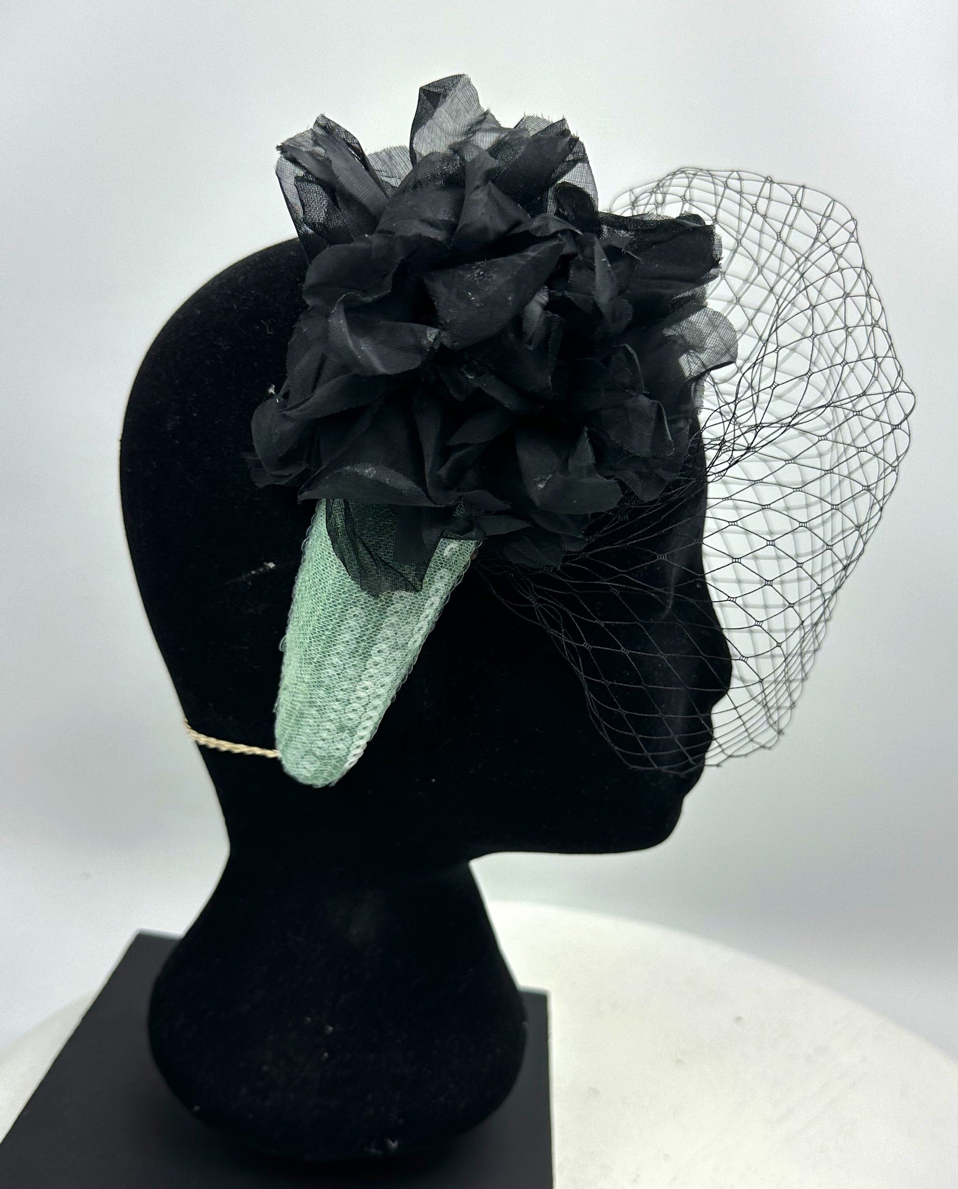 EDDIE is a Mint Green Sequined Headband trimmed with a Handmade Black Organza Flower and Black Veiling.