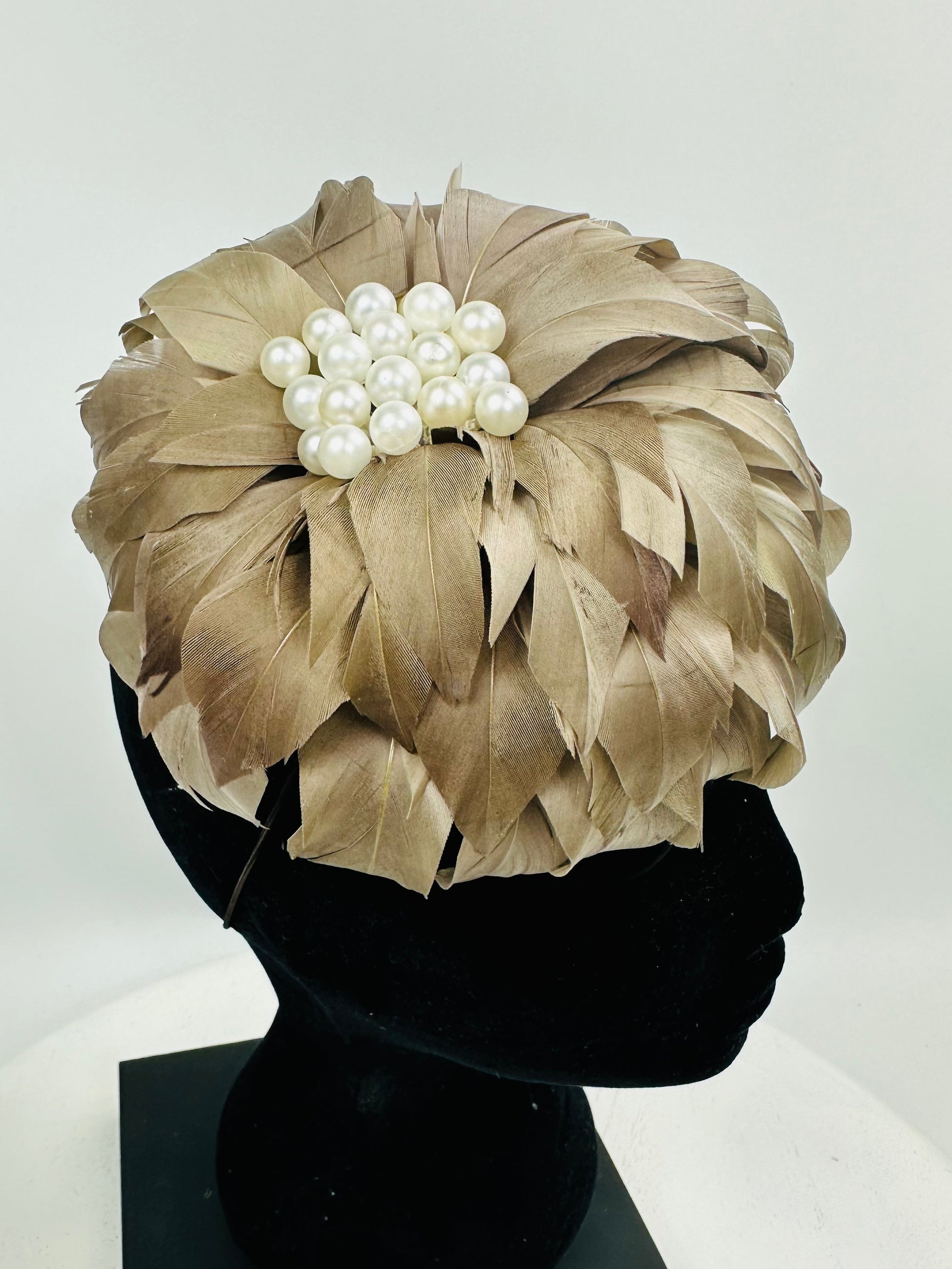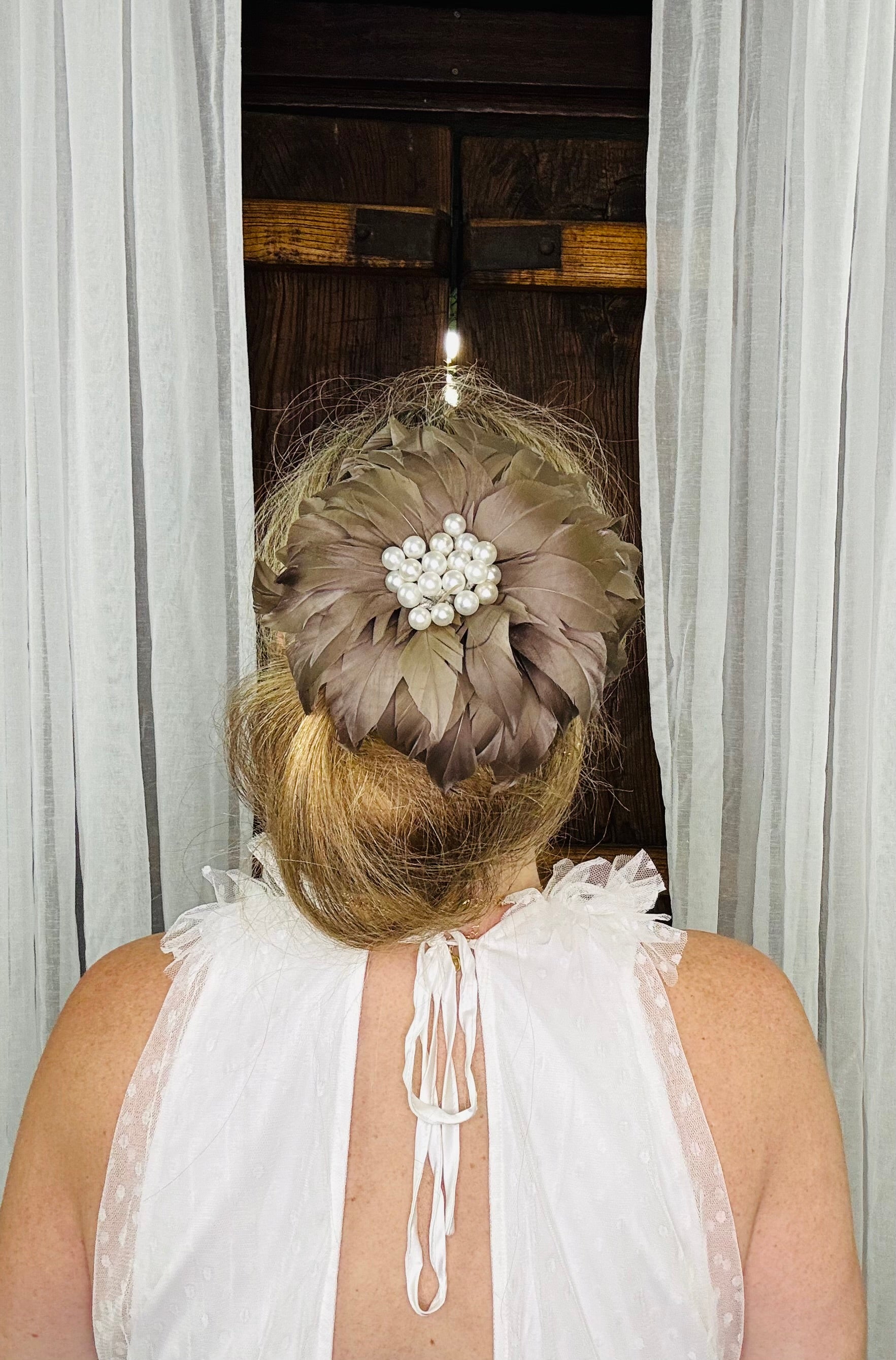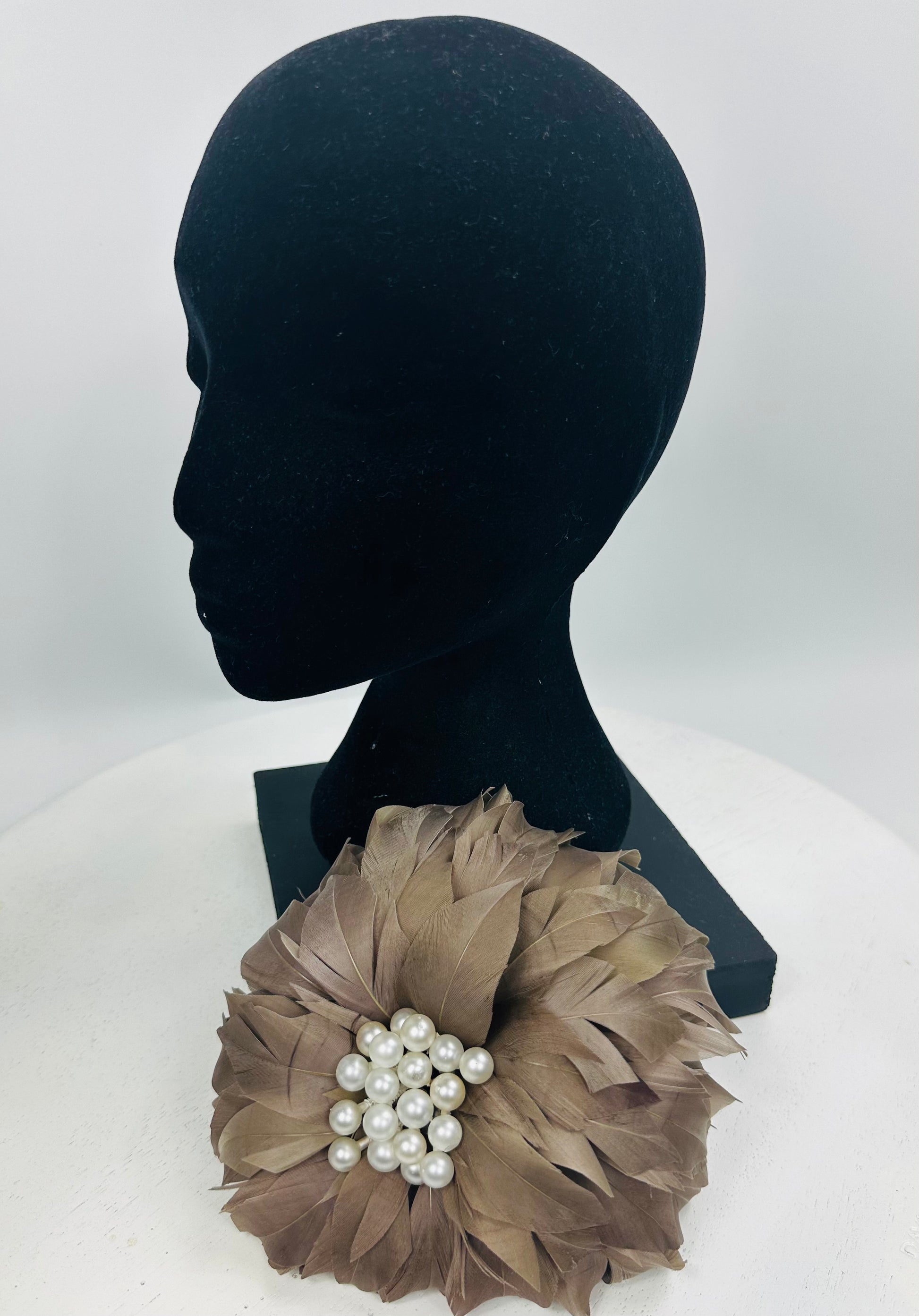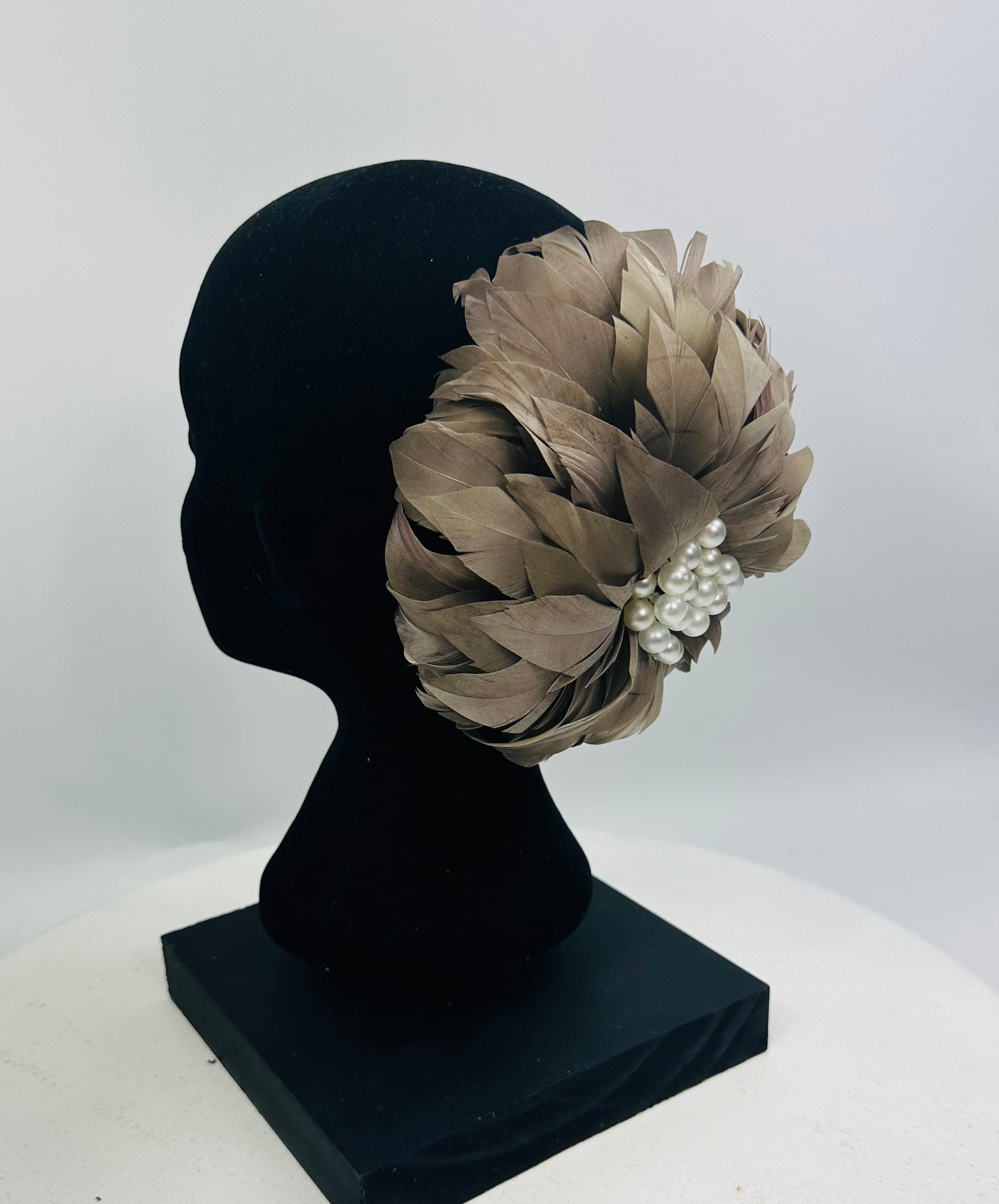 Genevive is a Latte coloured Feather Flower with multiple Pearls in the centre. She has an Elastic, a Comb and a Pin so can be worn on either side or the back of the Head, or as a Brooch. Light as a Feather !
