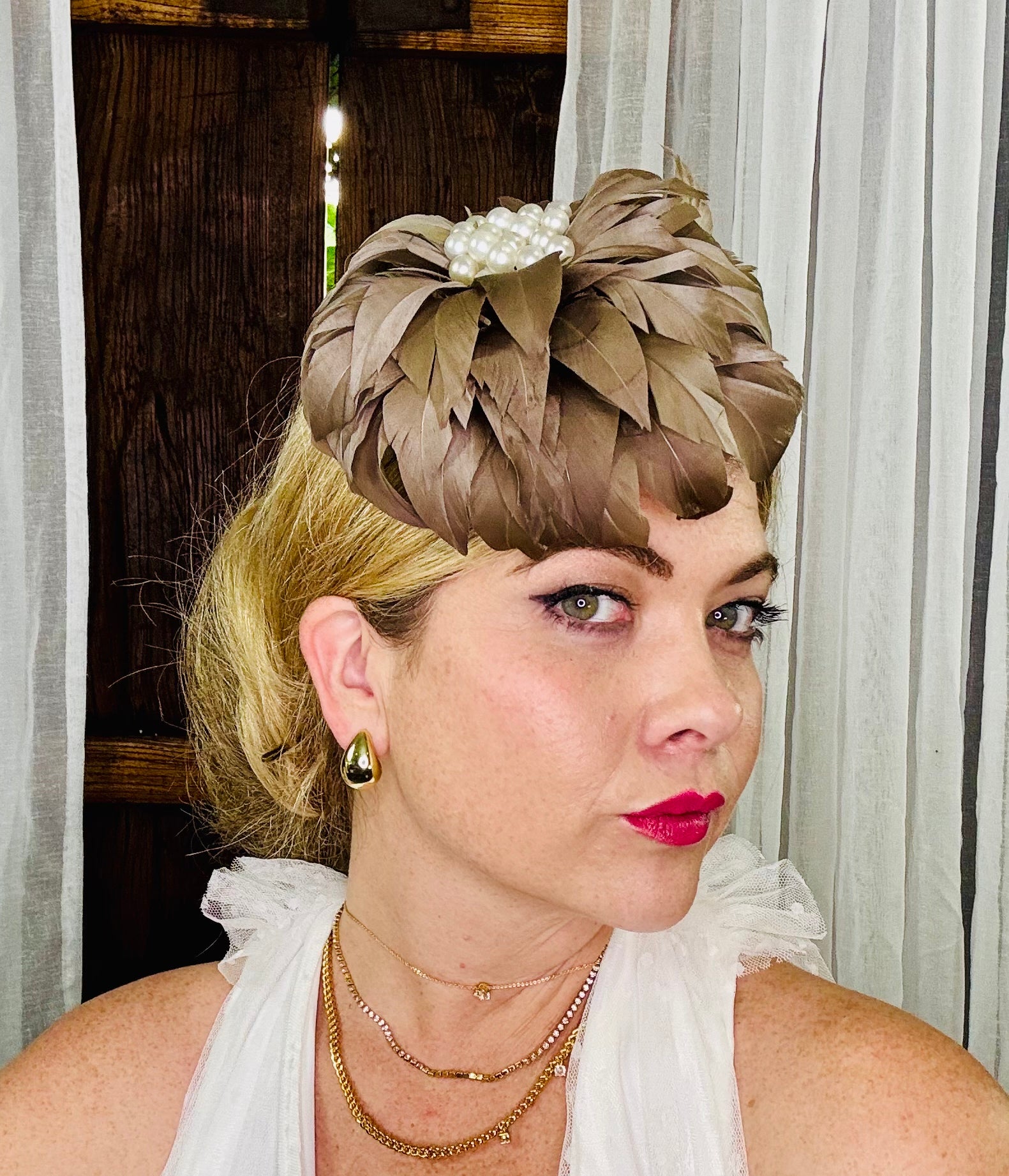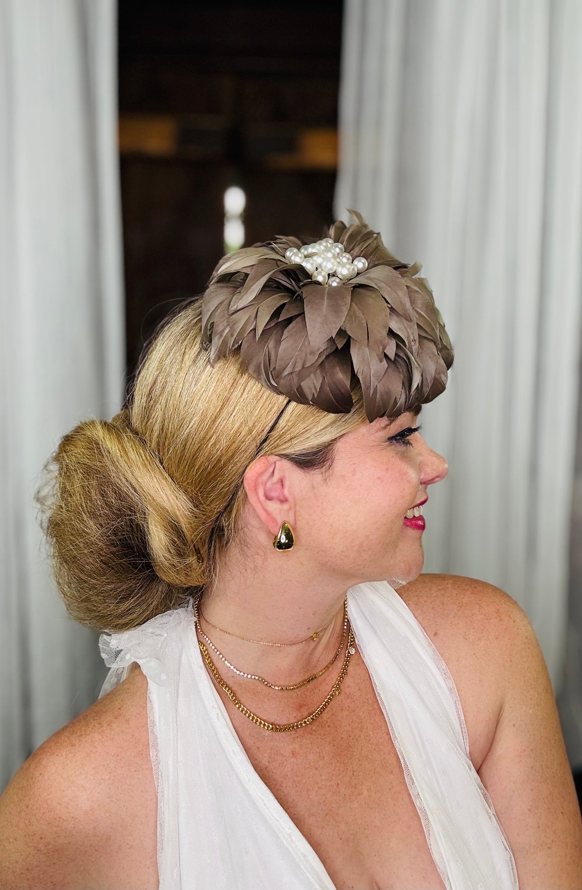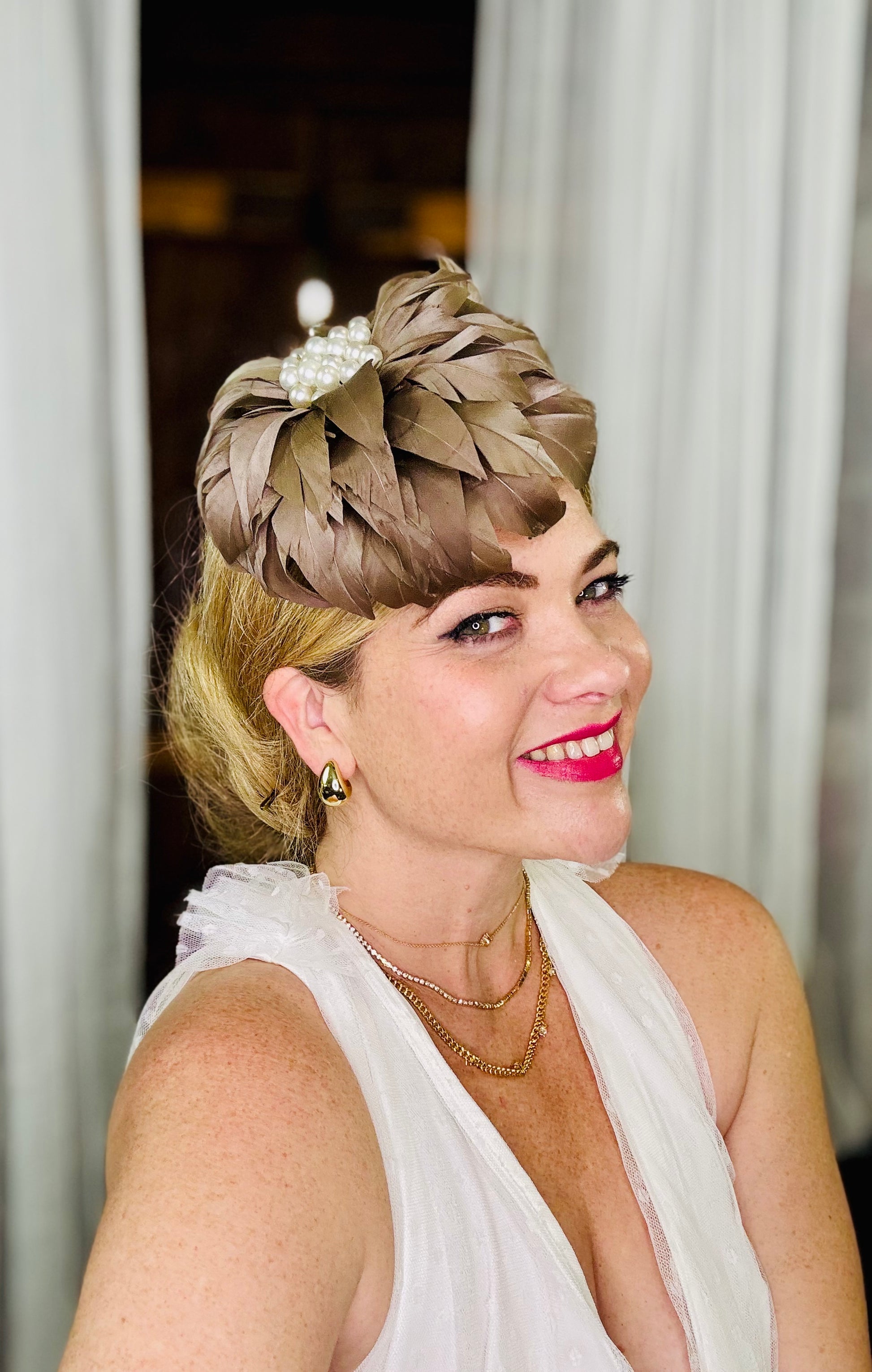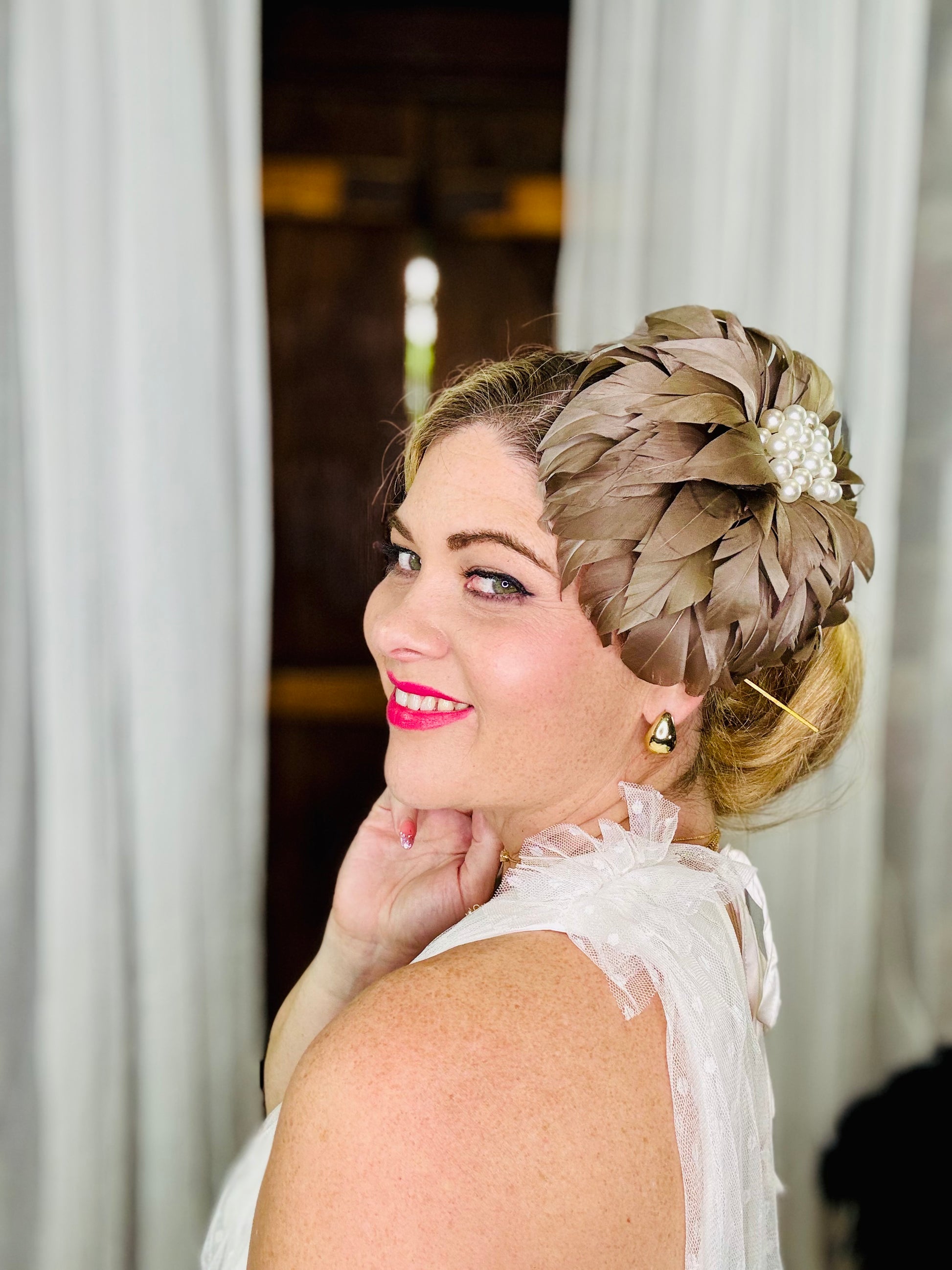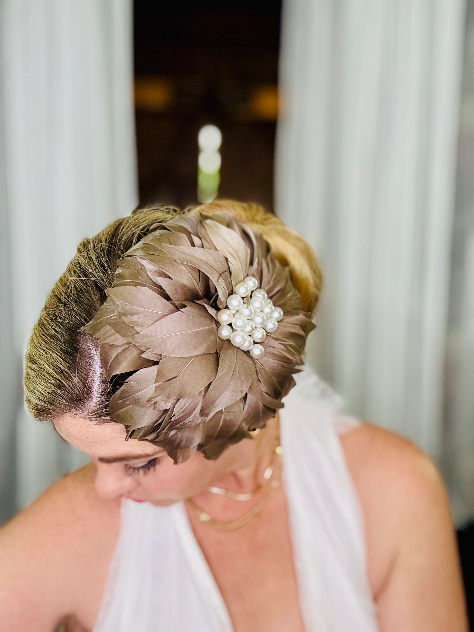 Genevive is a Latte coloured Feather Flower with multiple Pearls in the centre. She has an Elastic, a Comb and a Pin so can be worn on either side or the back of the Head, or as a Brooch. Light as a Feather !