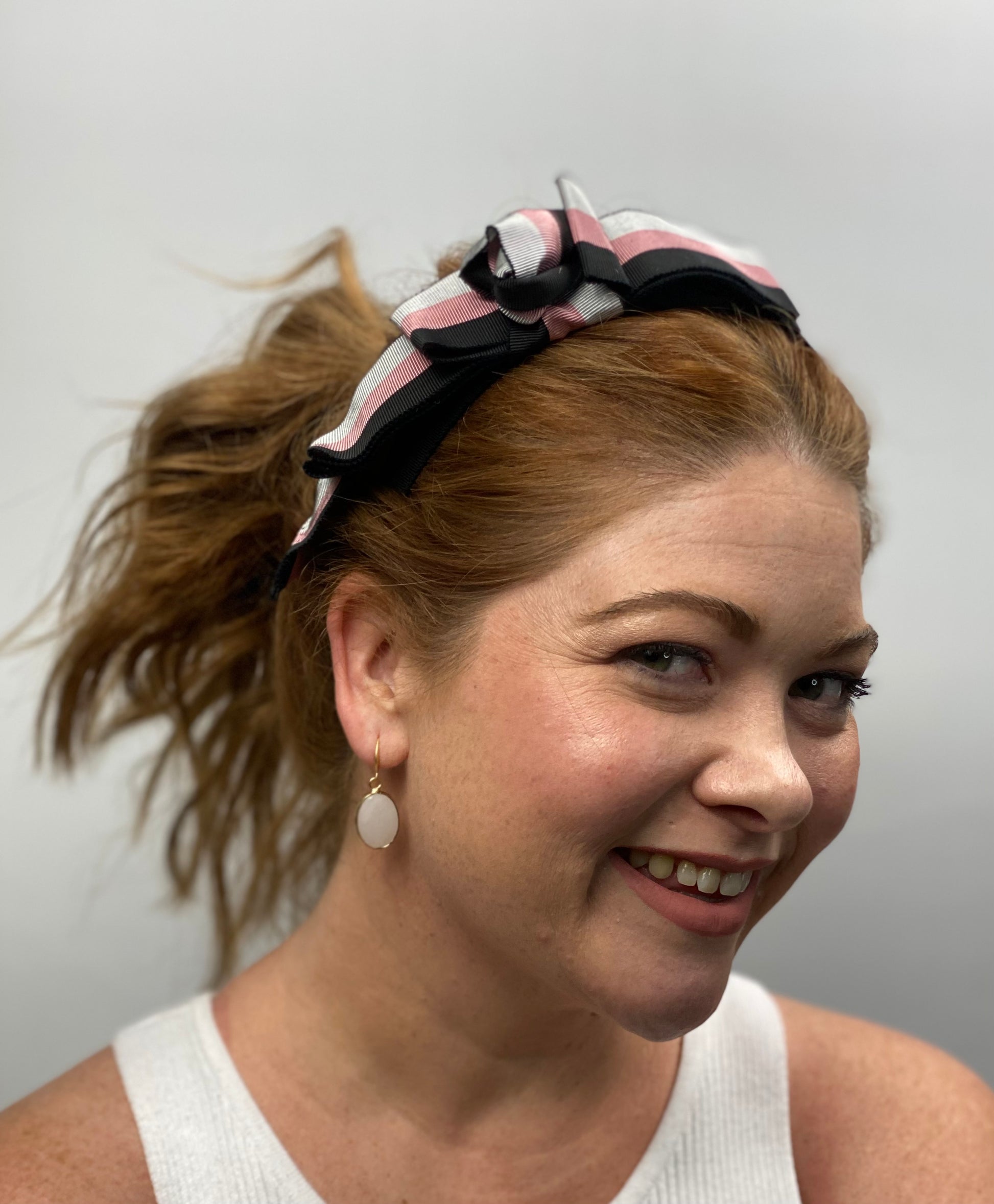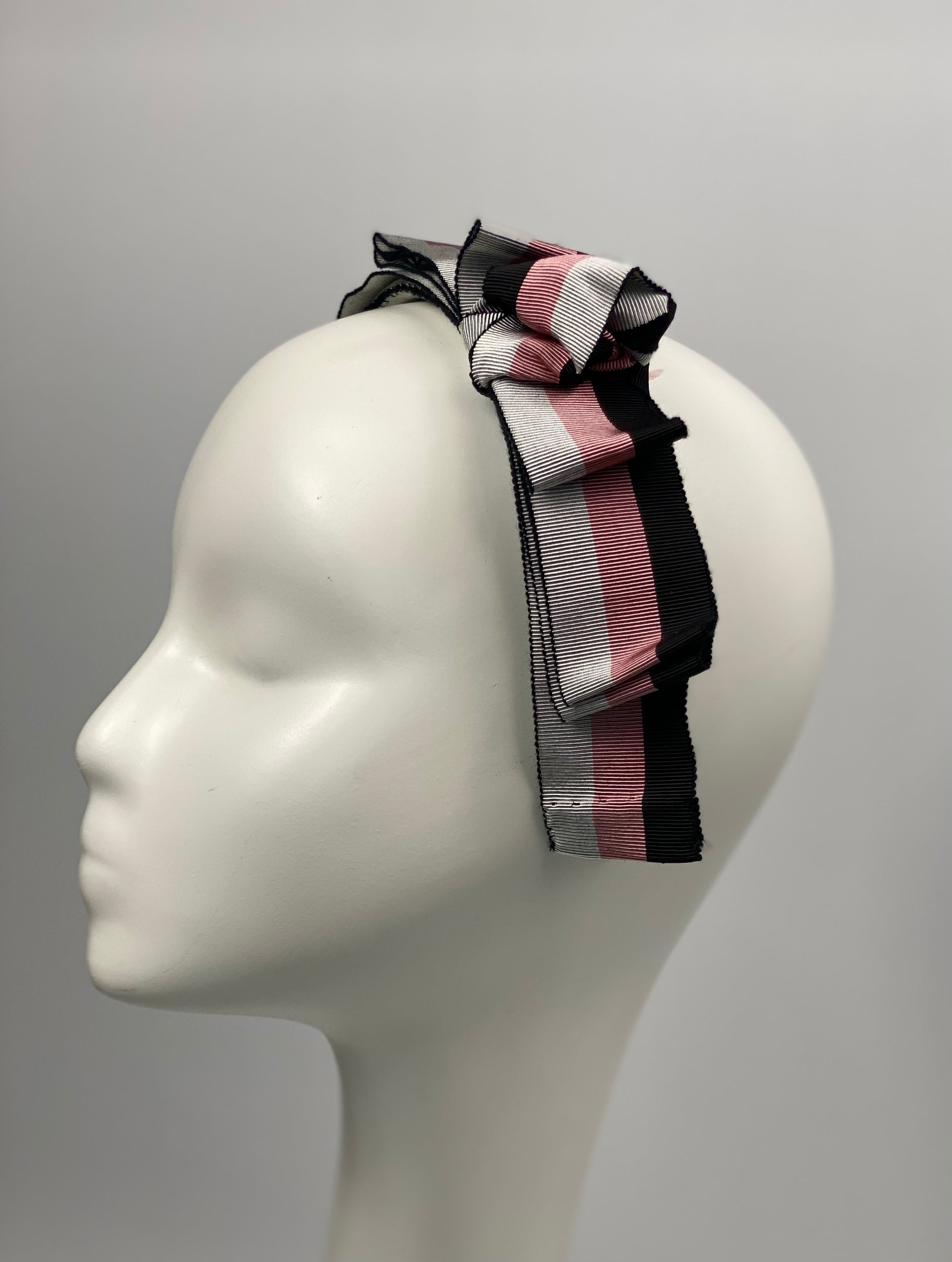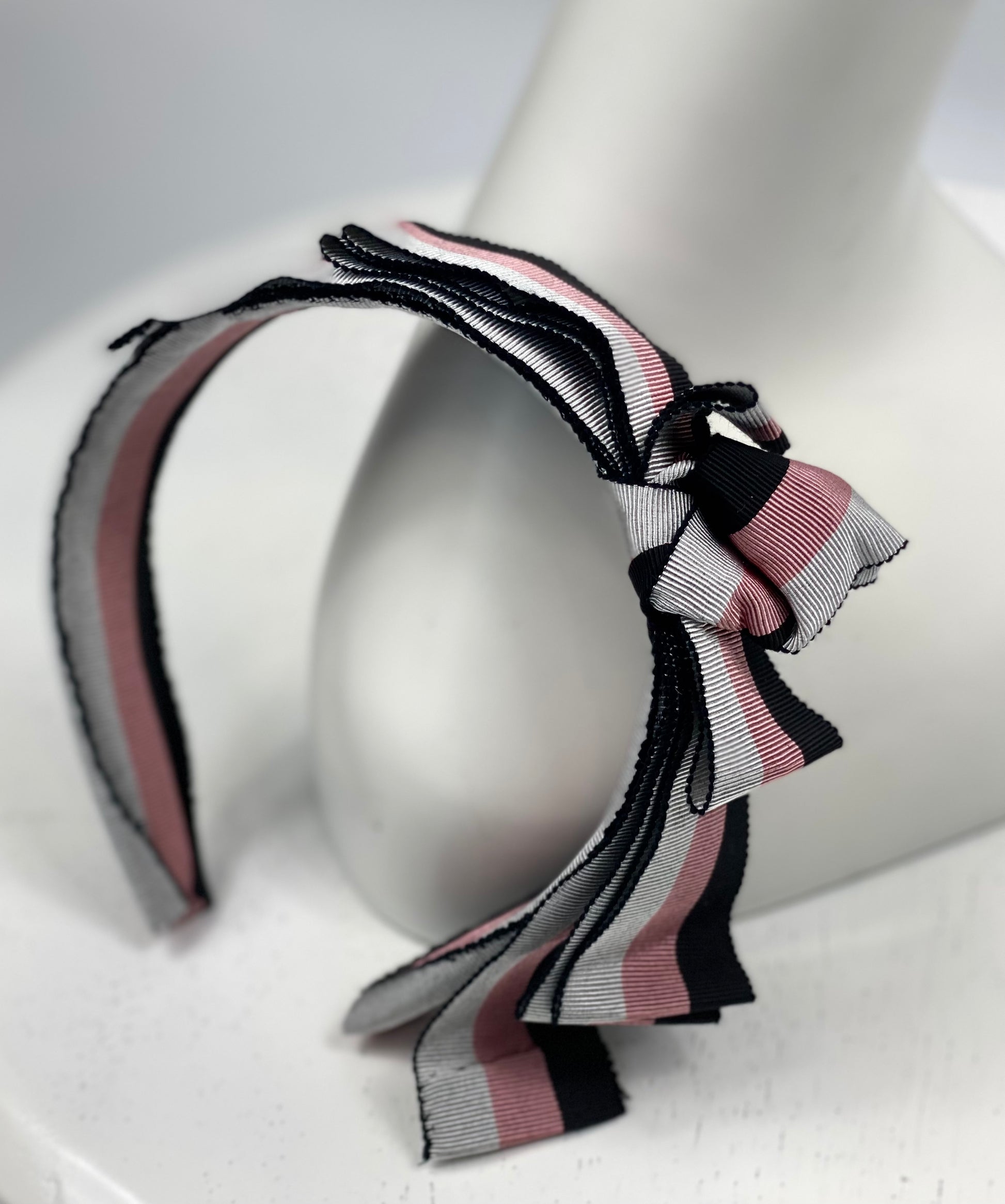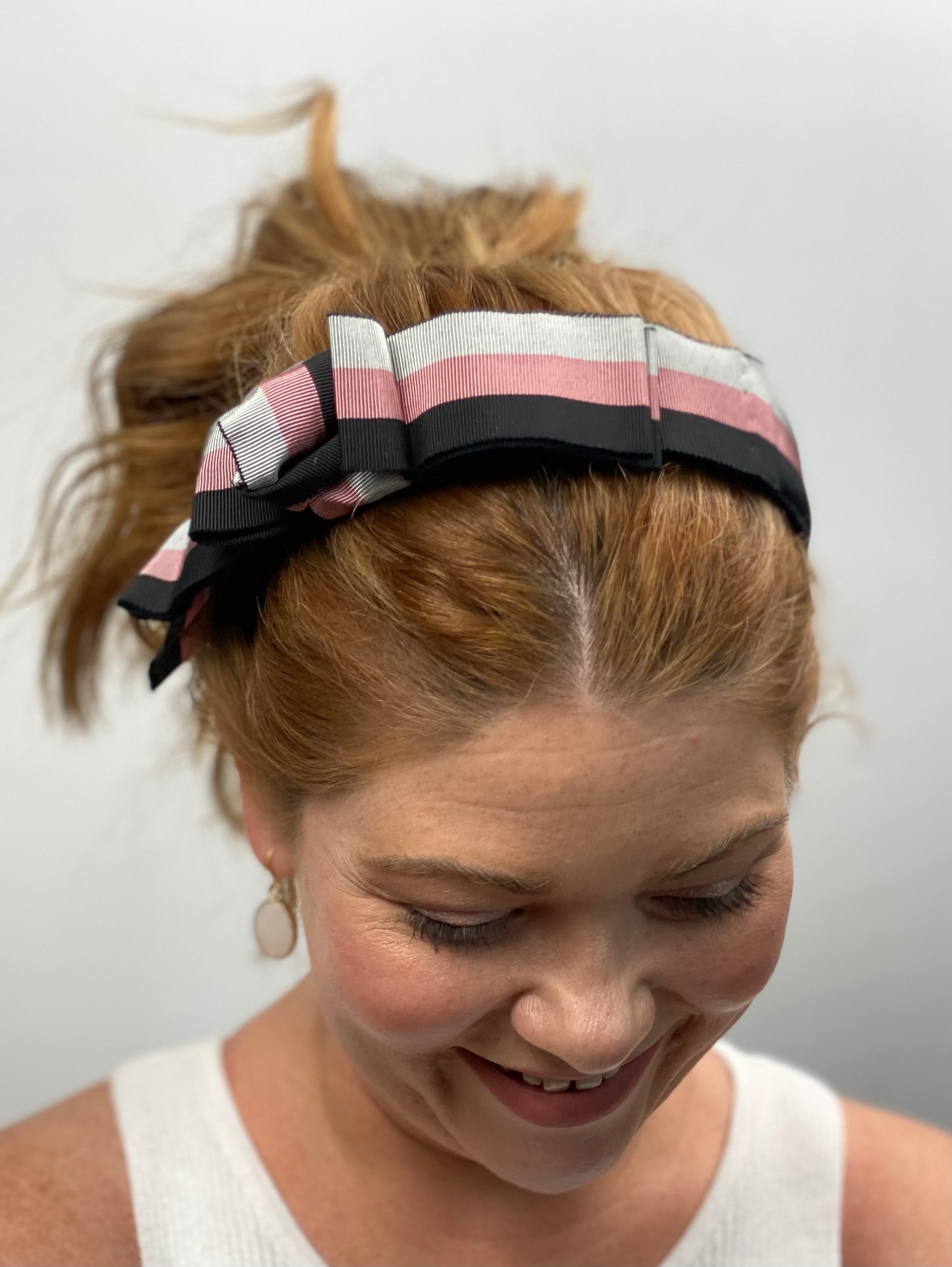 Hattie is a simple Headband of wide Grosgrain ribbon. Black, Pink and Grey Stripes with a small bow and knot on top.
