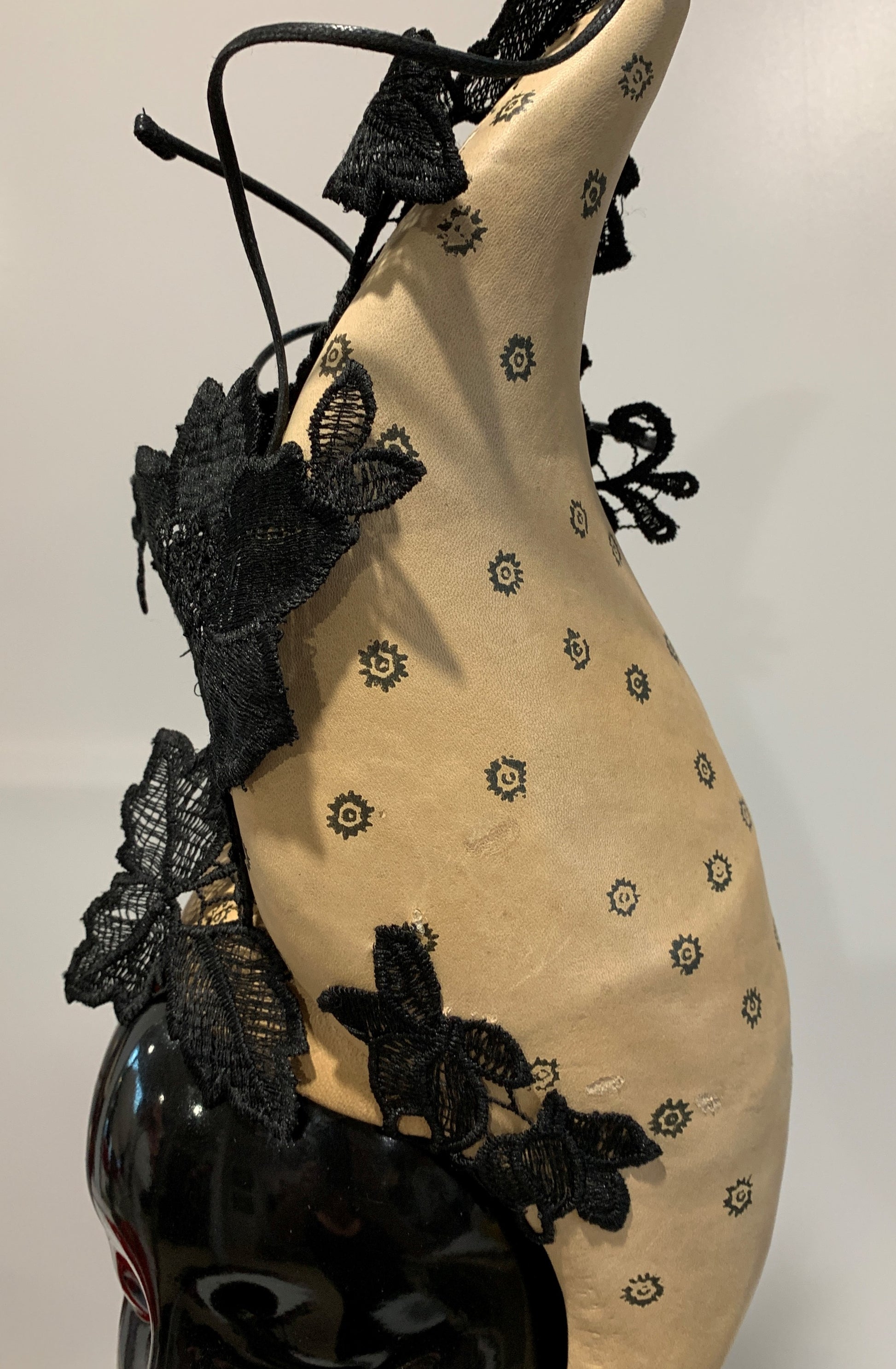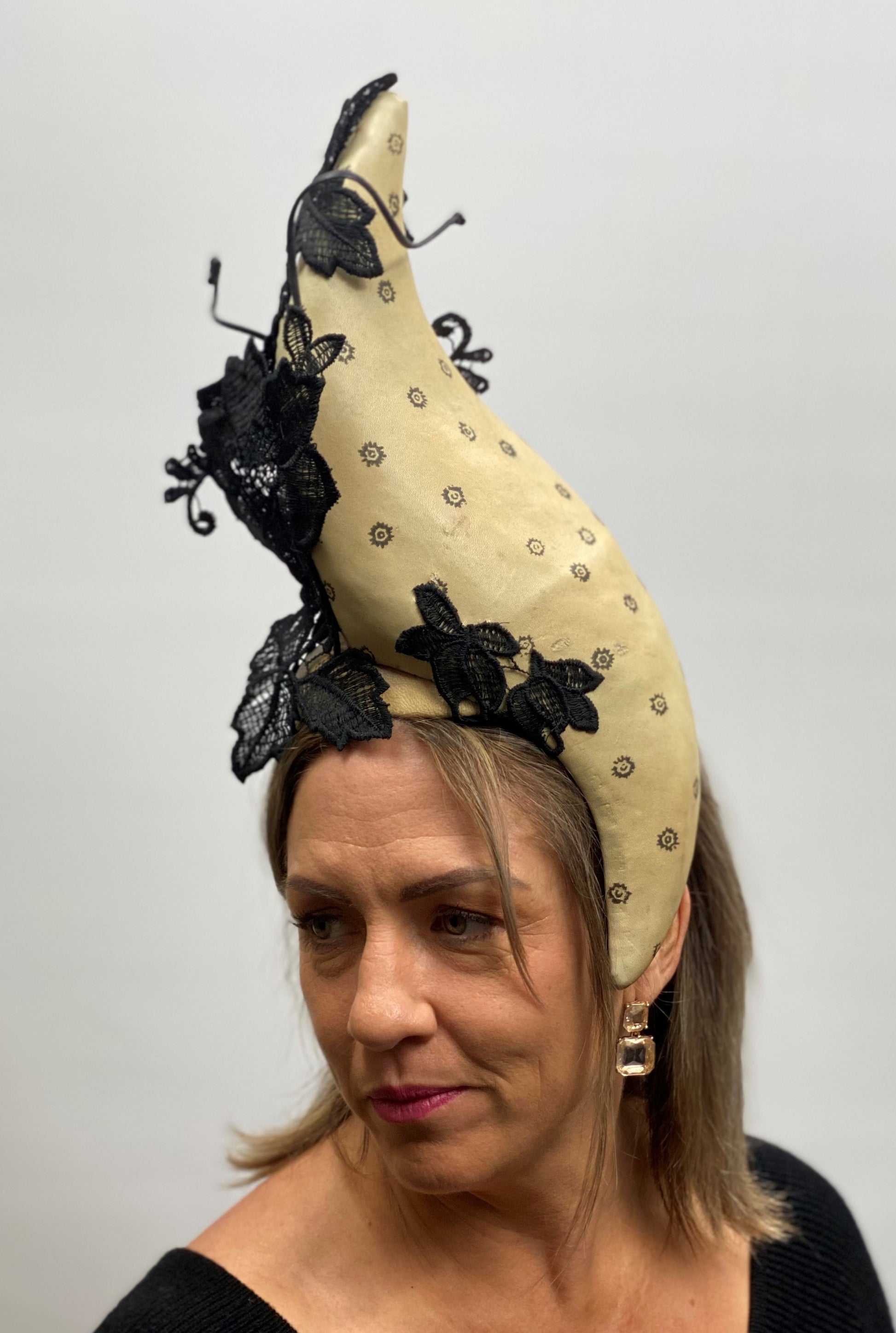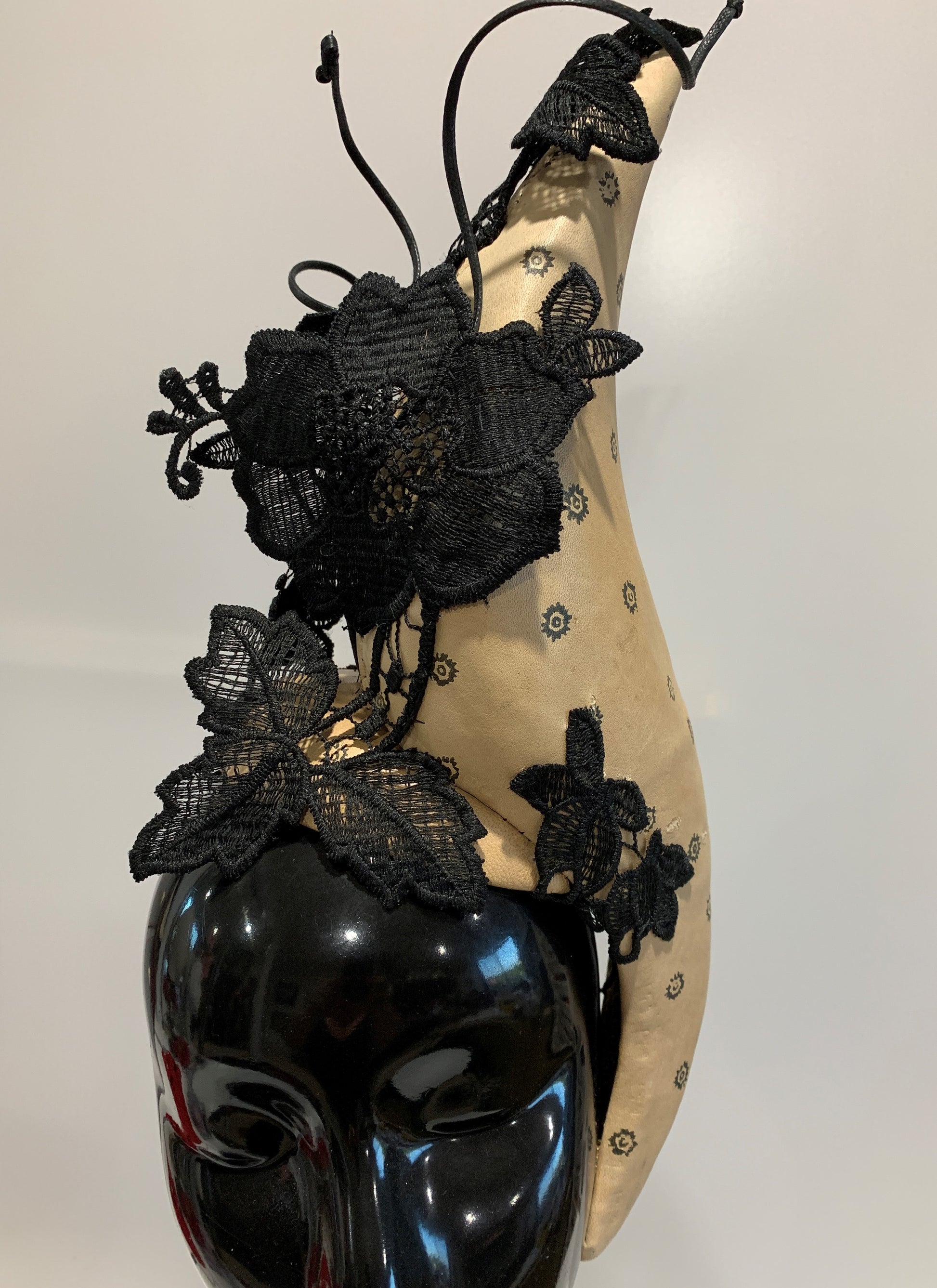 IRIS Sculptural Leather Headpiece Fascinator Race Hat Black Lace