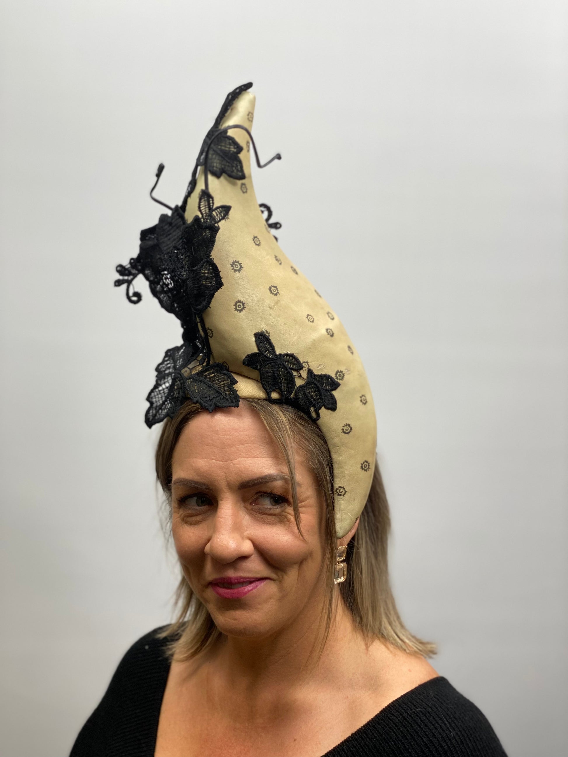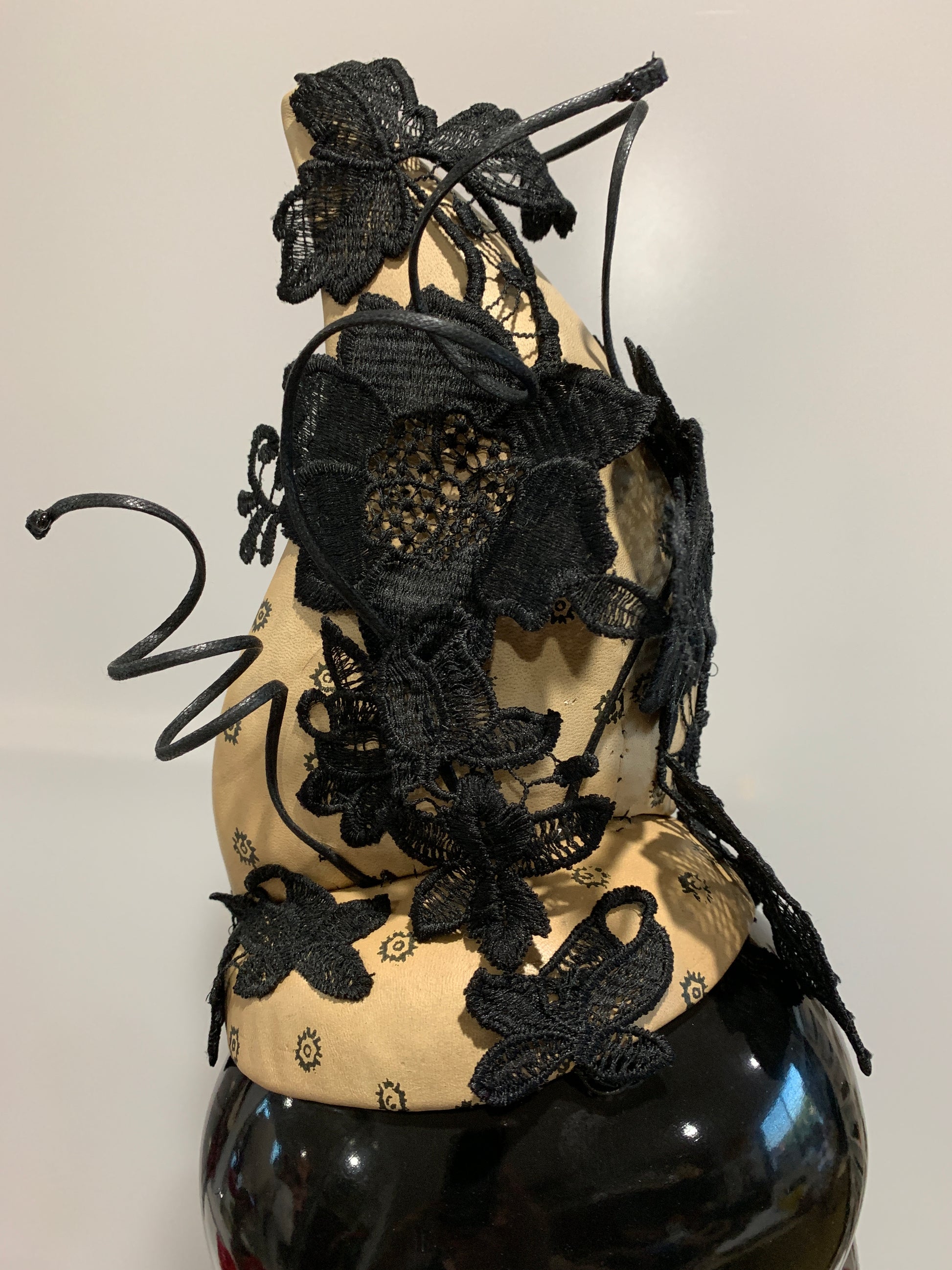 Trimmed with individual Pieces of Black Guipure Lace which have been Stiffened and Wired and Intertwined with Fine Black Rouleau.