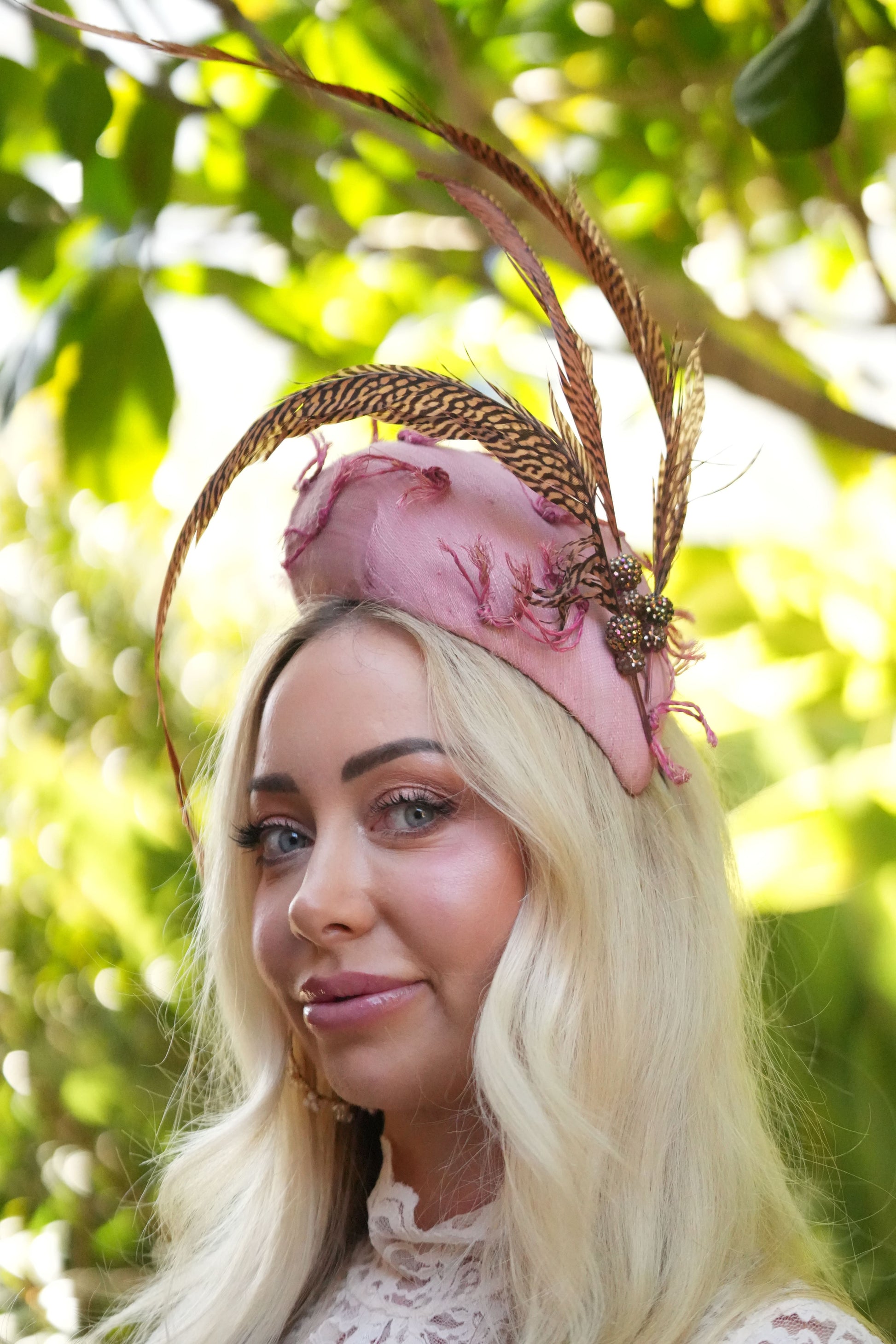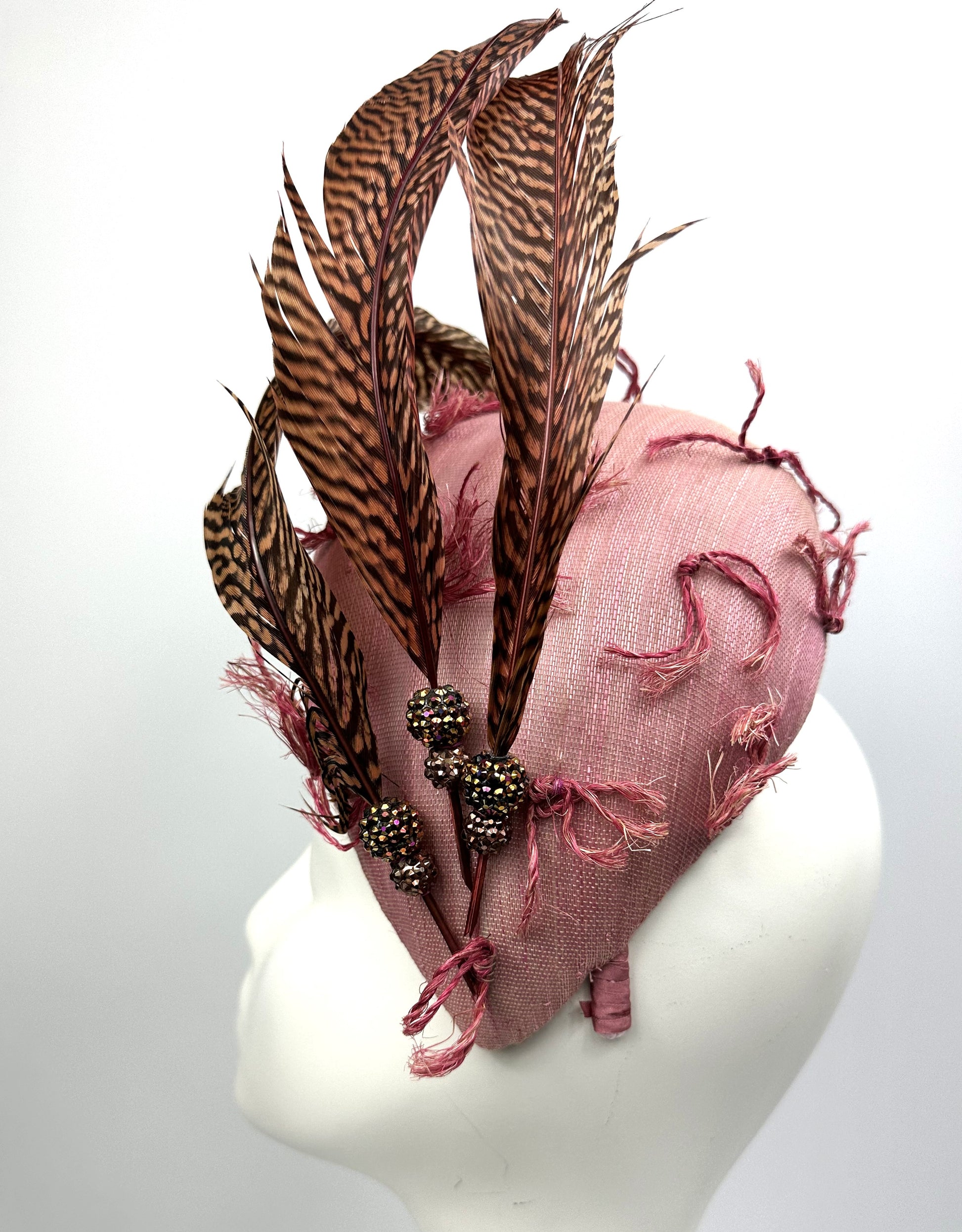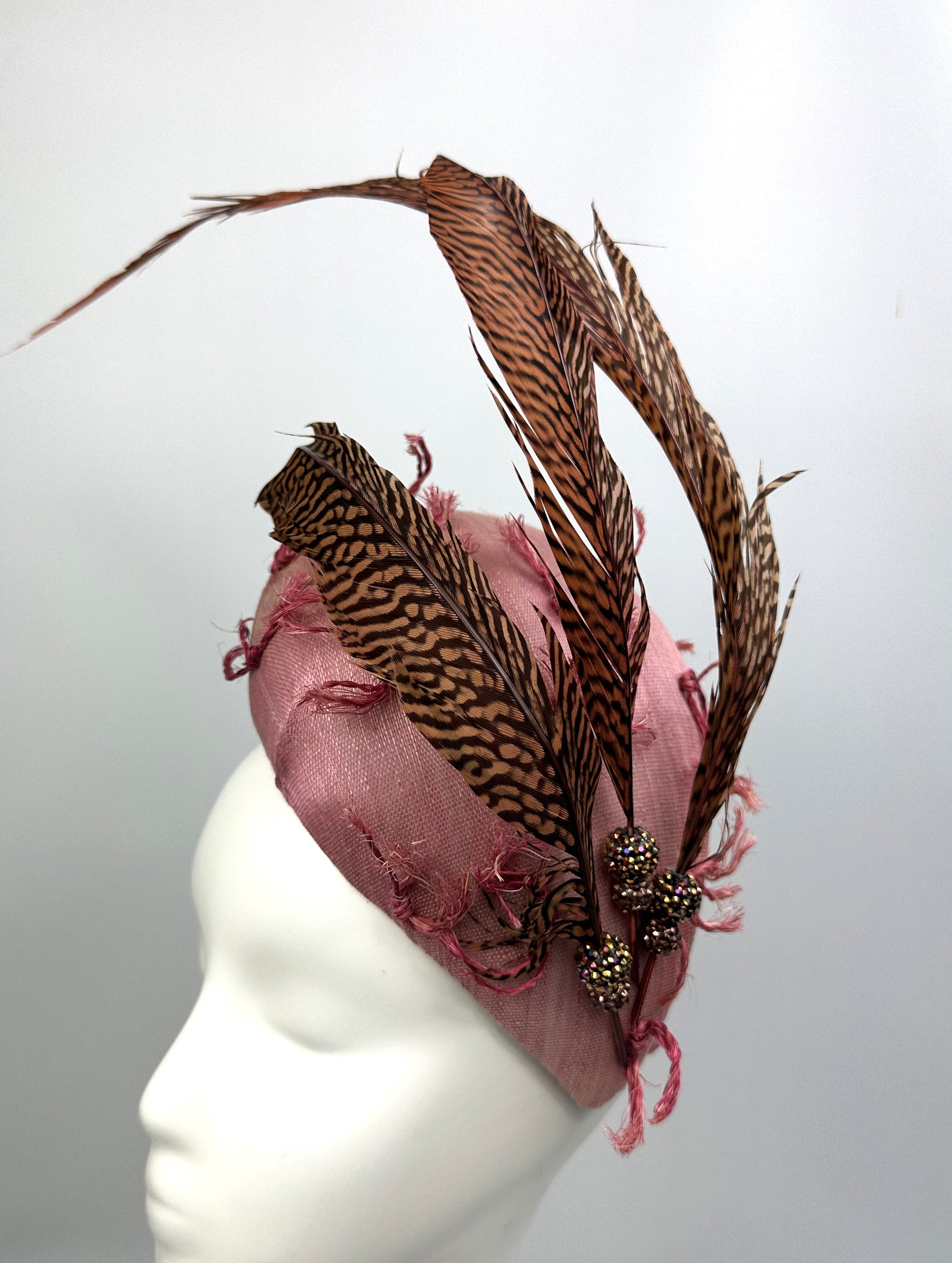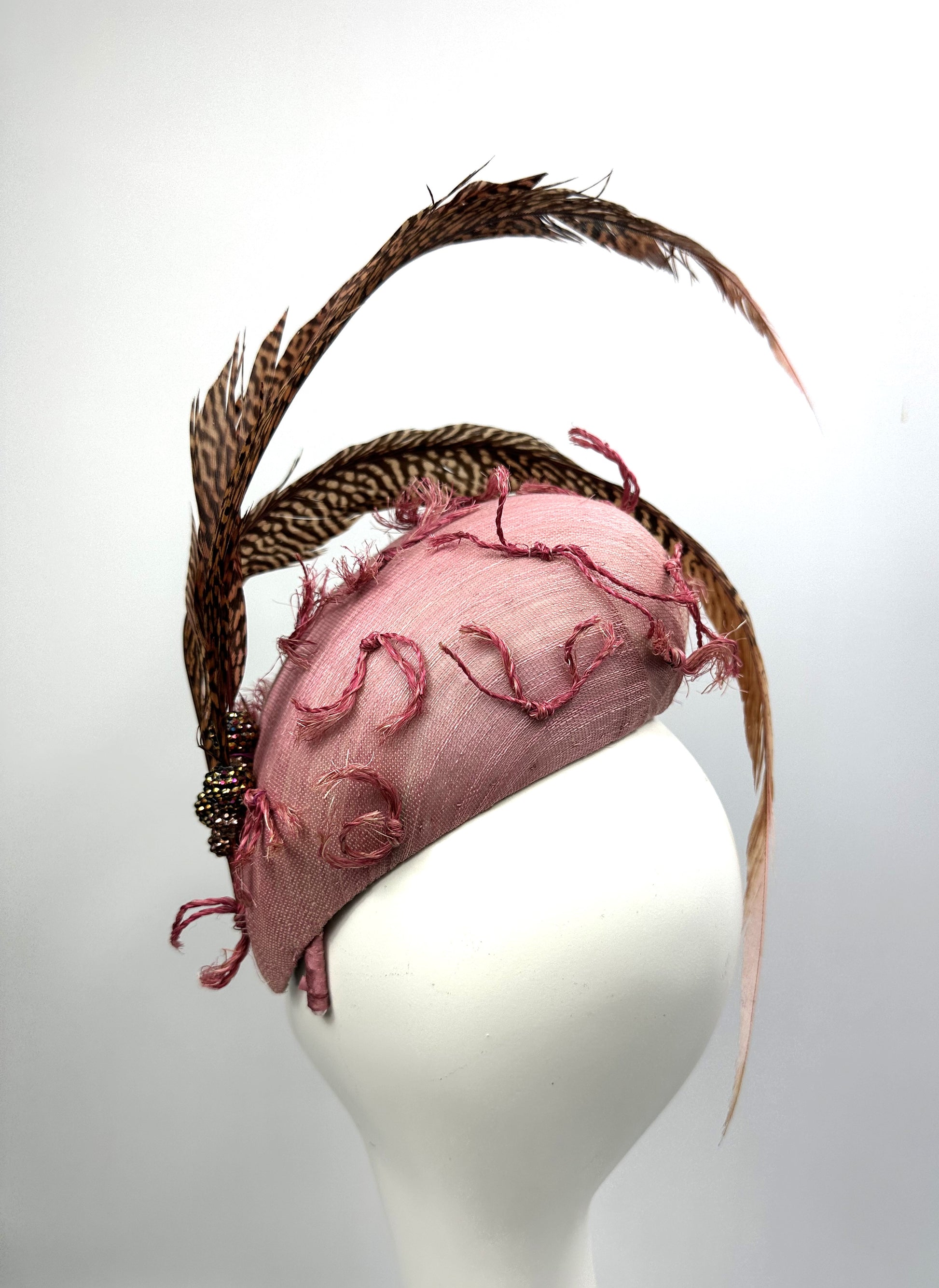 Jade is a Face Hugger Style Hat, made from Vintage Straw Cloth. A Beautiful Pink with additional pieces of Straw stitched on. Trimmed with Pheasant Feathers and Gold Beads.