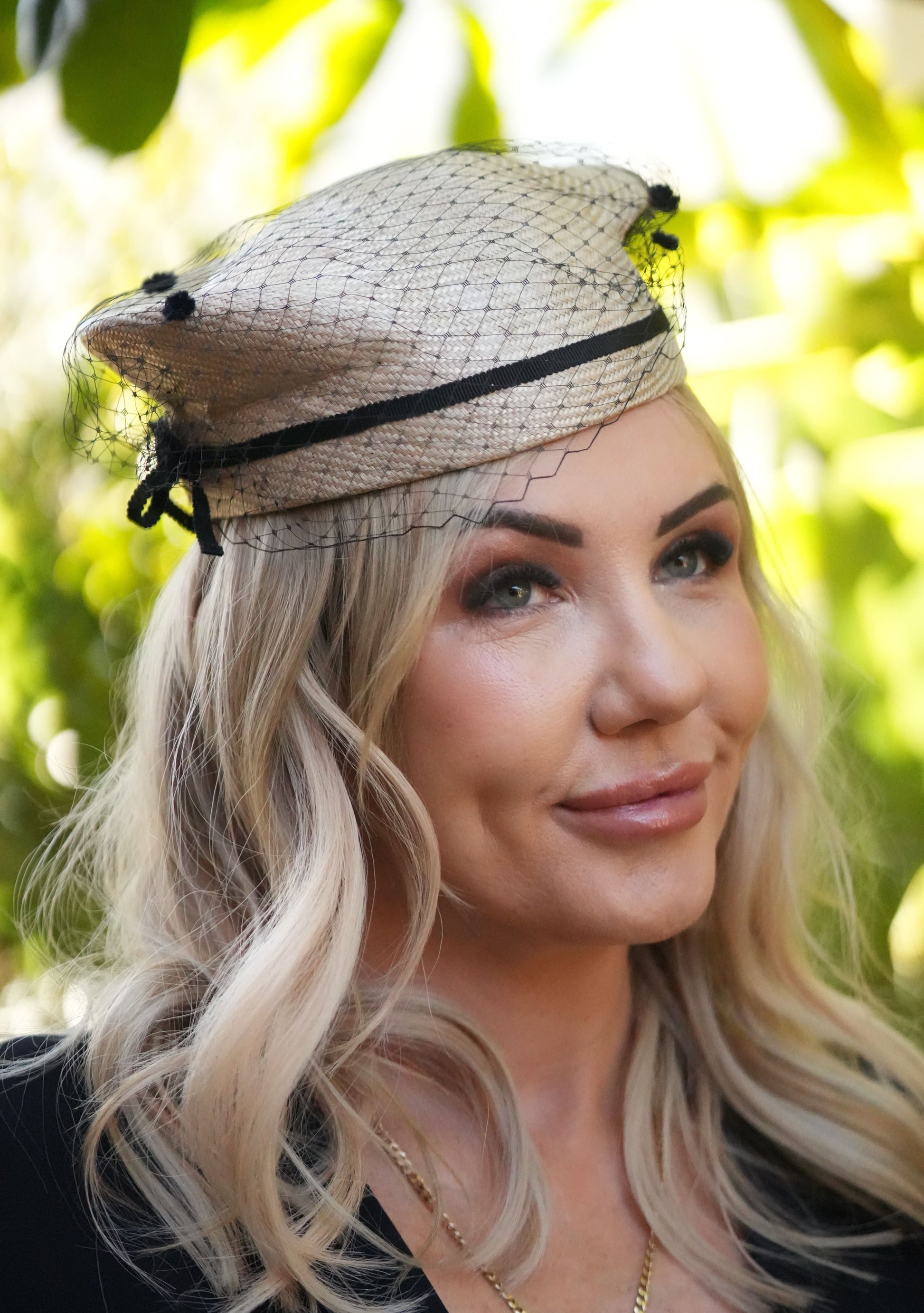 JEAN is a natural Straw Vintage Style Beret. She has a small Black Grosgrain Trim and Bow as well as Black Spotted Veiling.