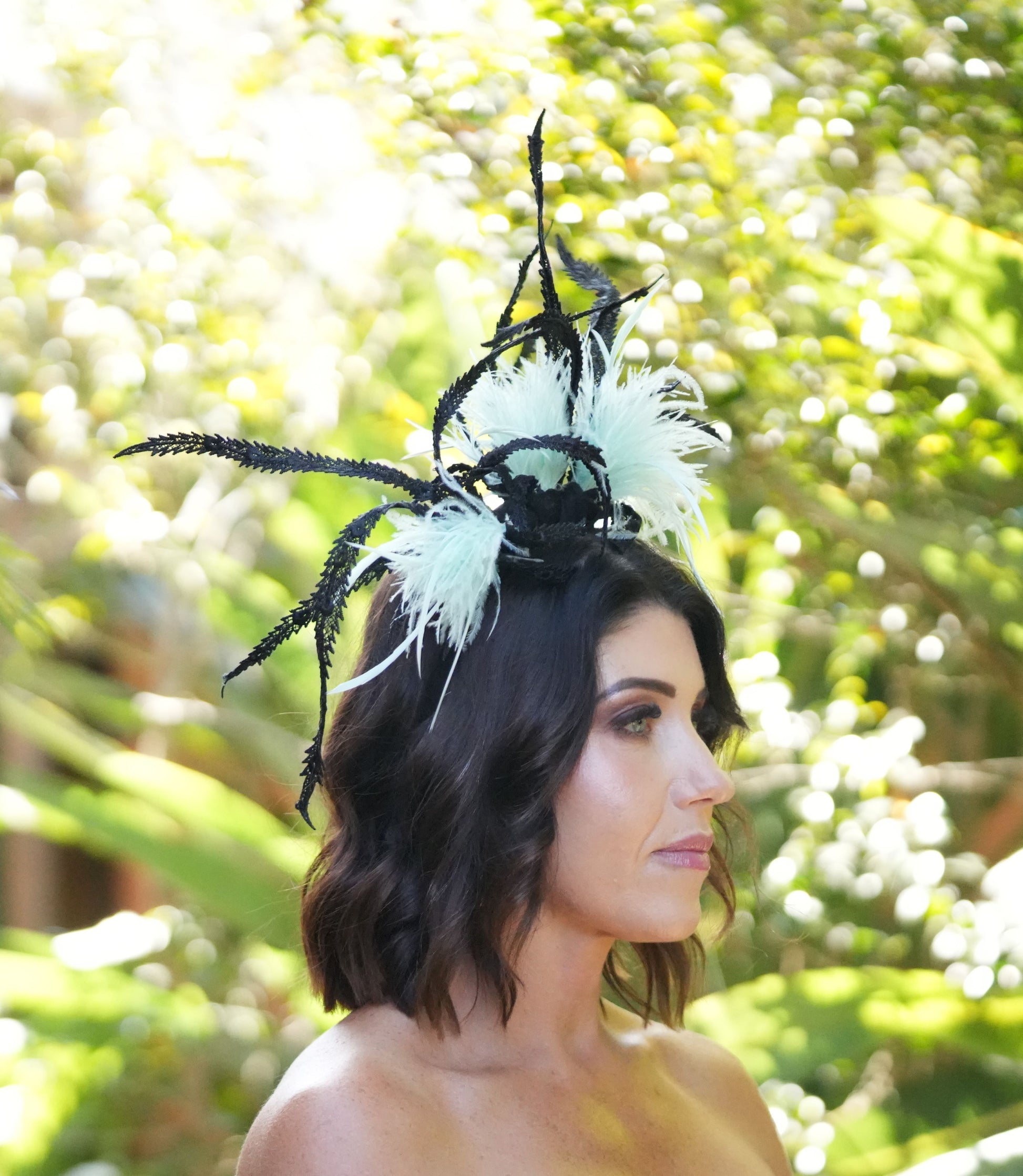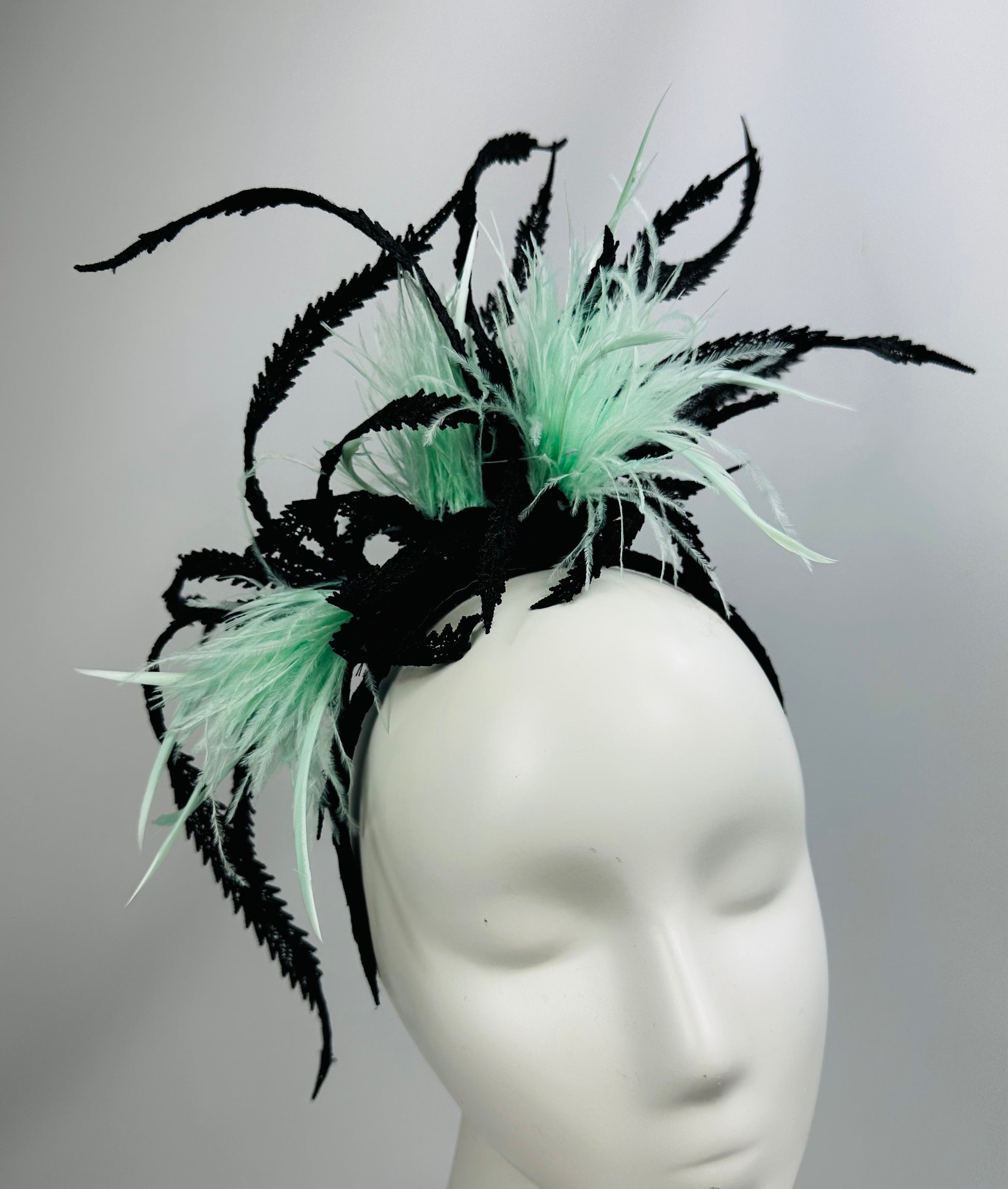 PEPPER is a Large Fascinator of Black Guipure Lace Flowers, and Mint Coloured Ostrich Feathers. Each Lace Flower has been Hand Wired, so it sits beautifully on the Head.