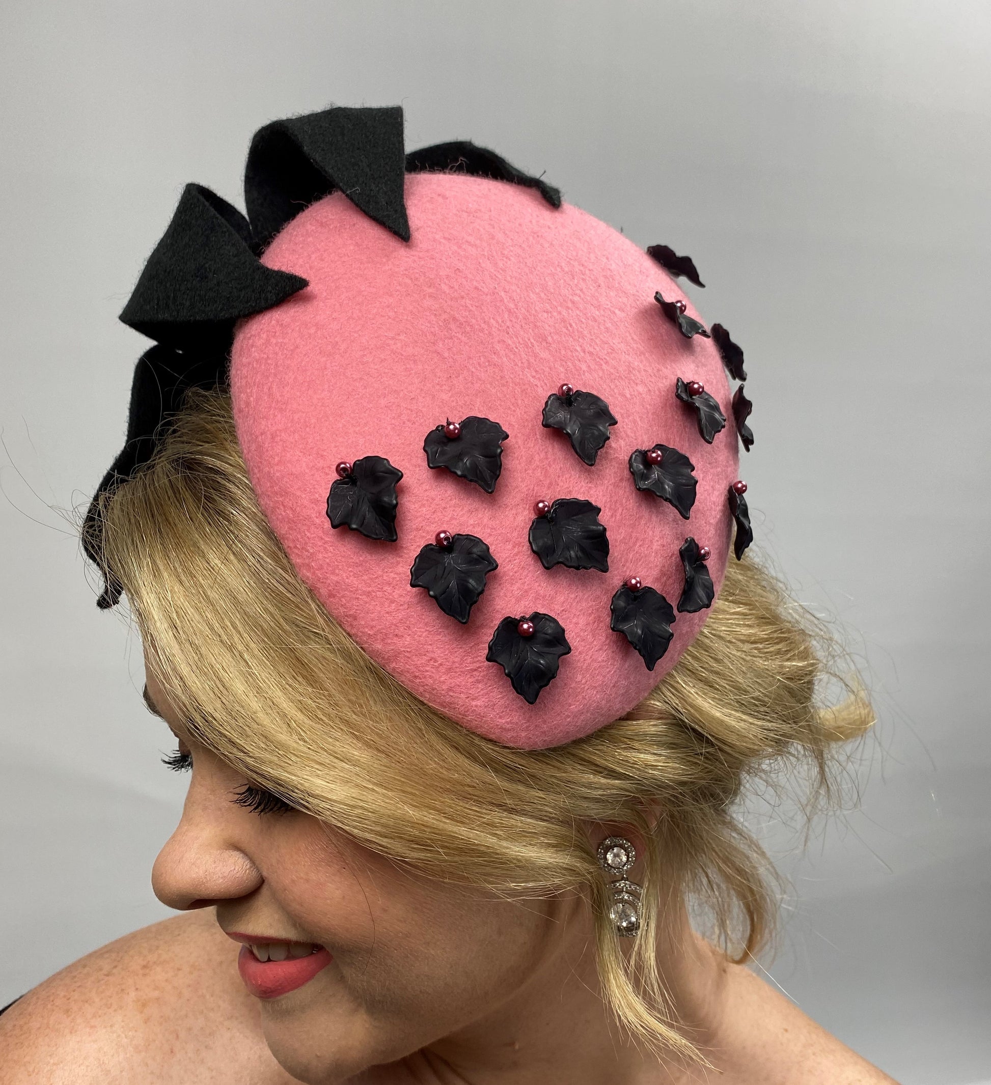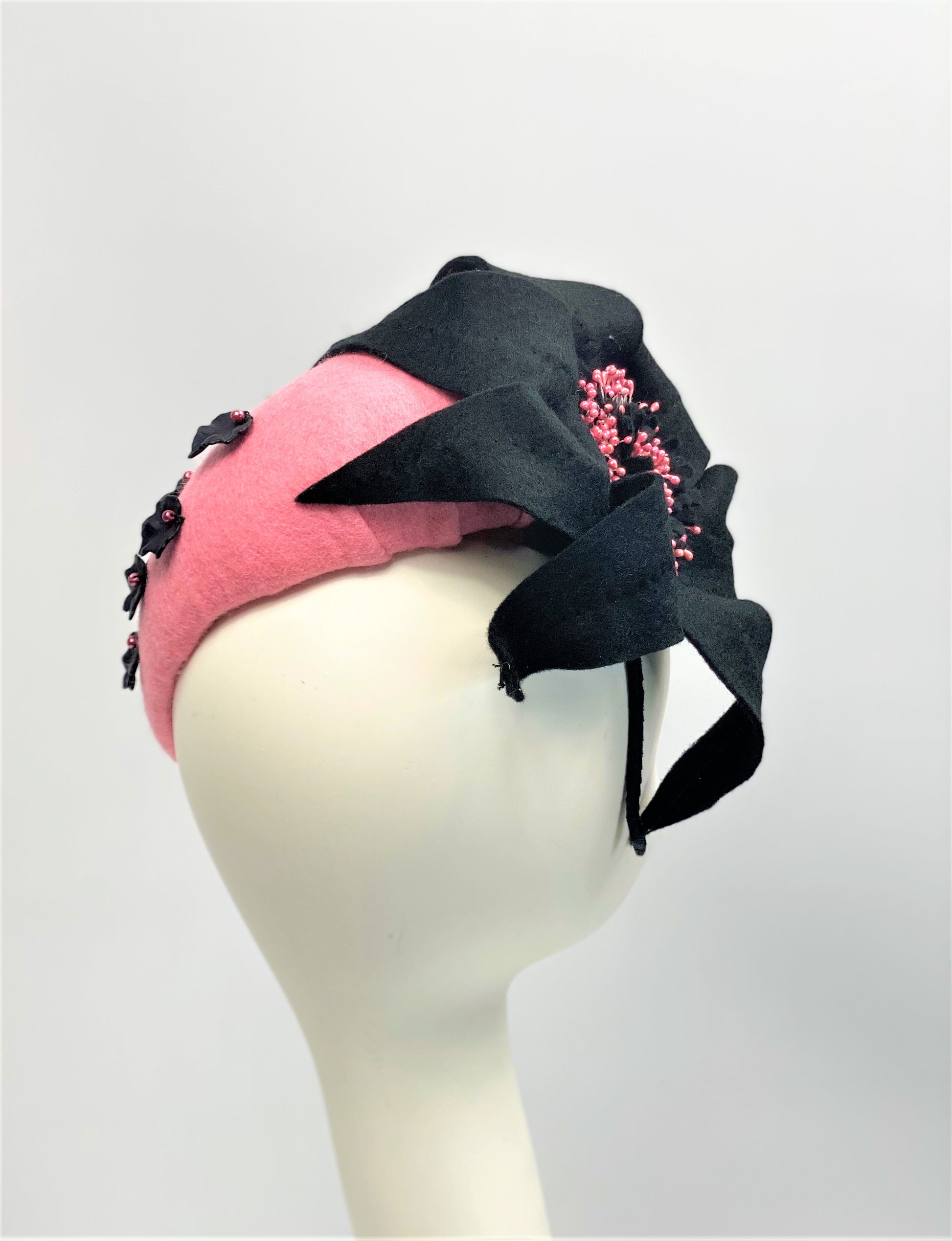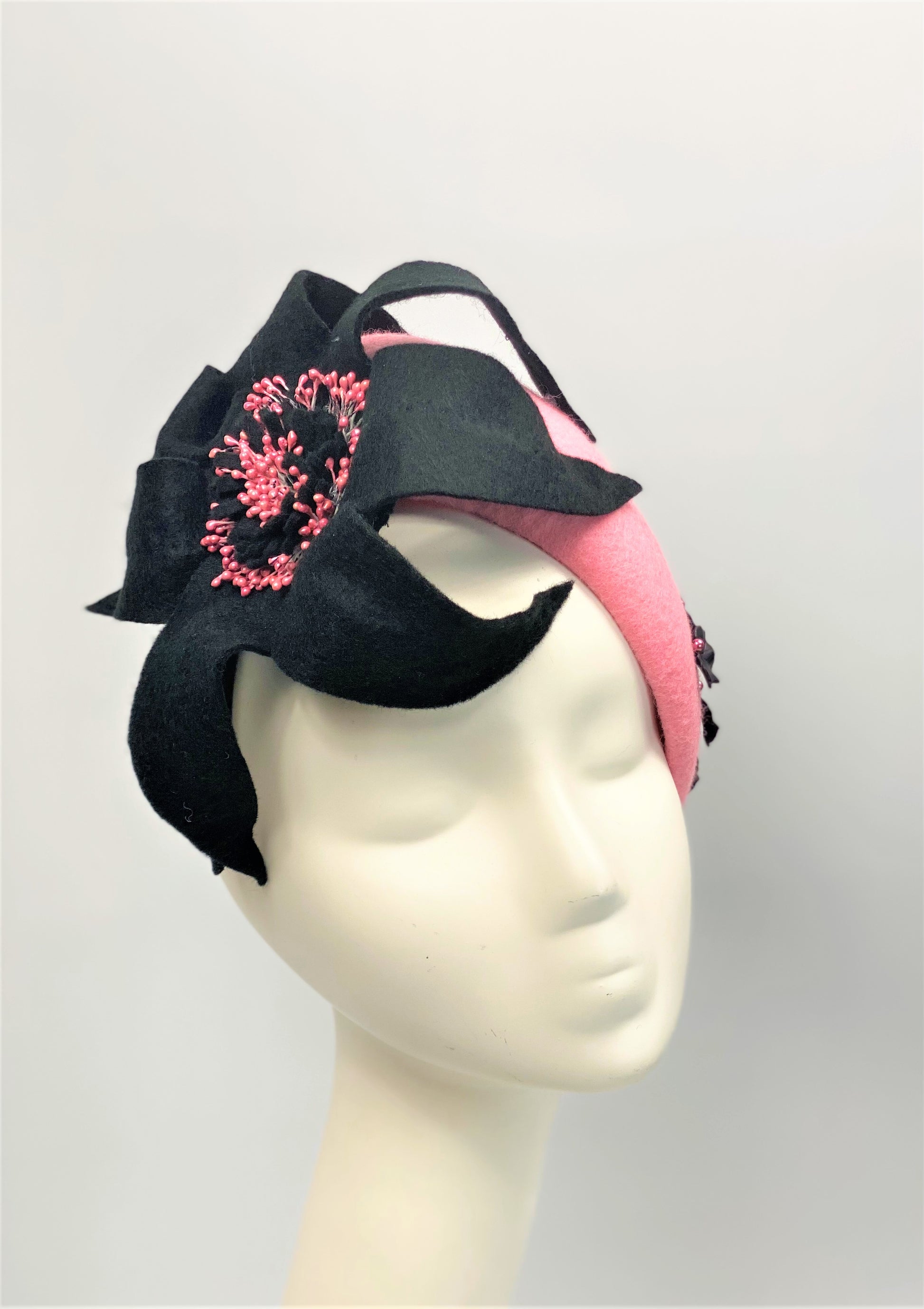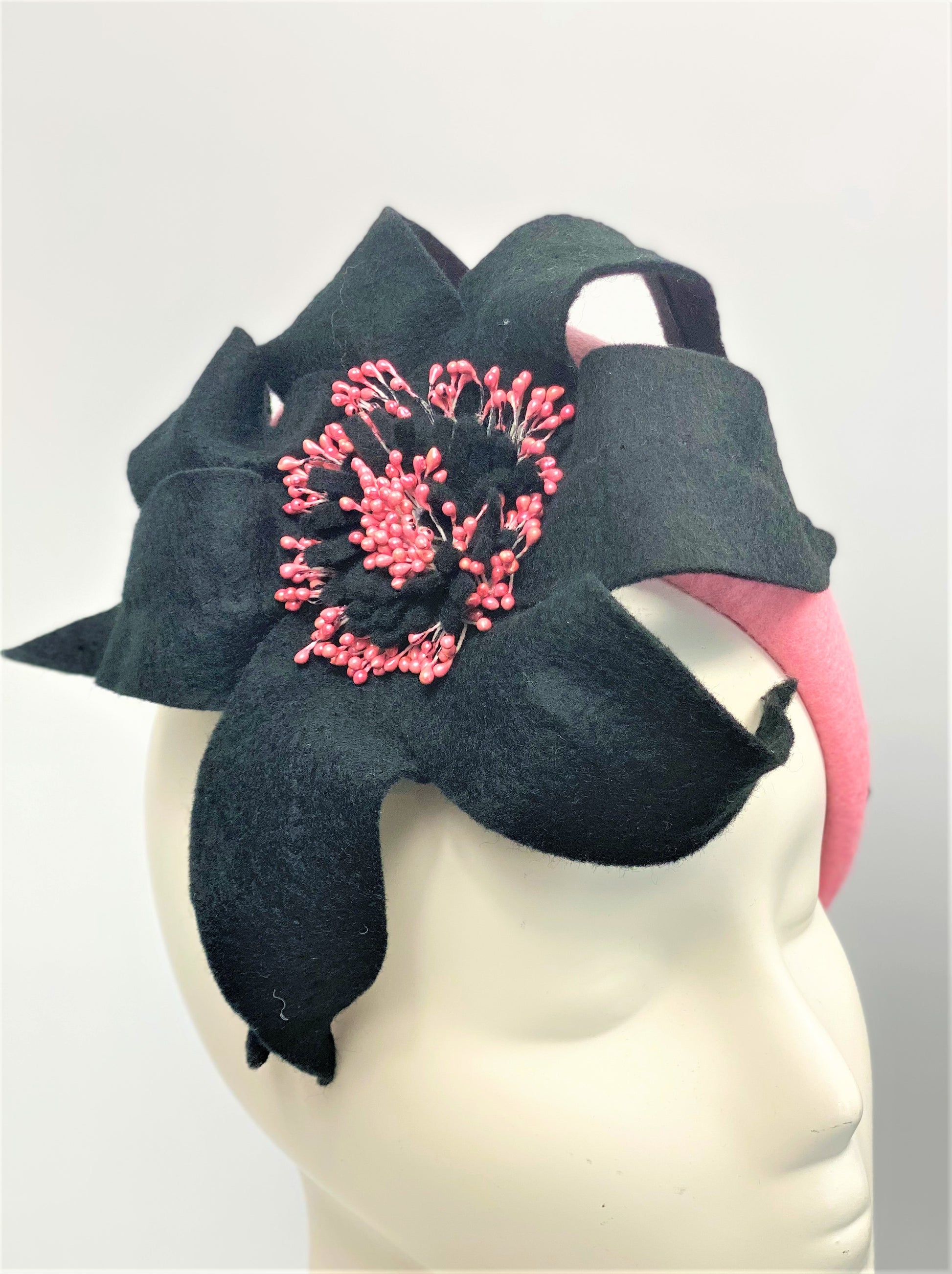 Phyliss is a Pink Felt Face Hugger with a Large Black Felt Handmade Flower and Black Beads. She is attached to a Headband and sits in place very comfortably. Very Wearable!