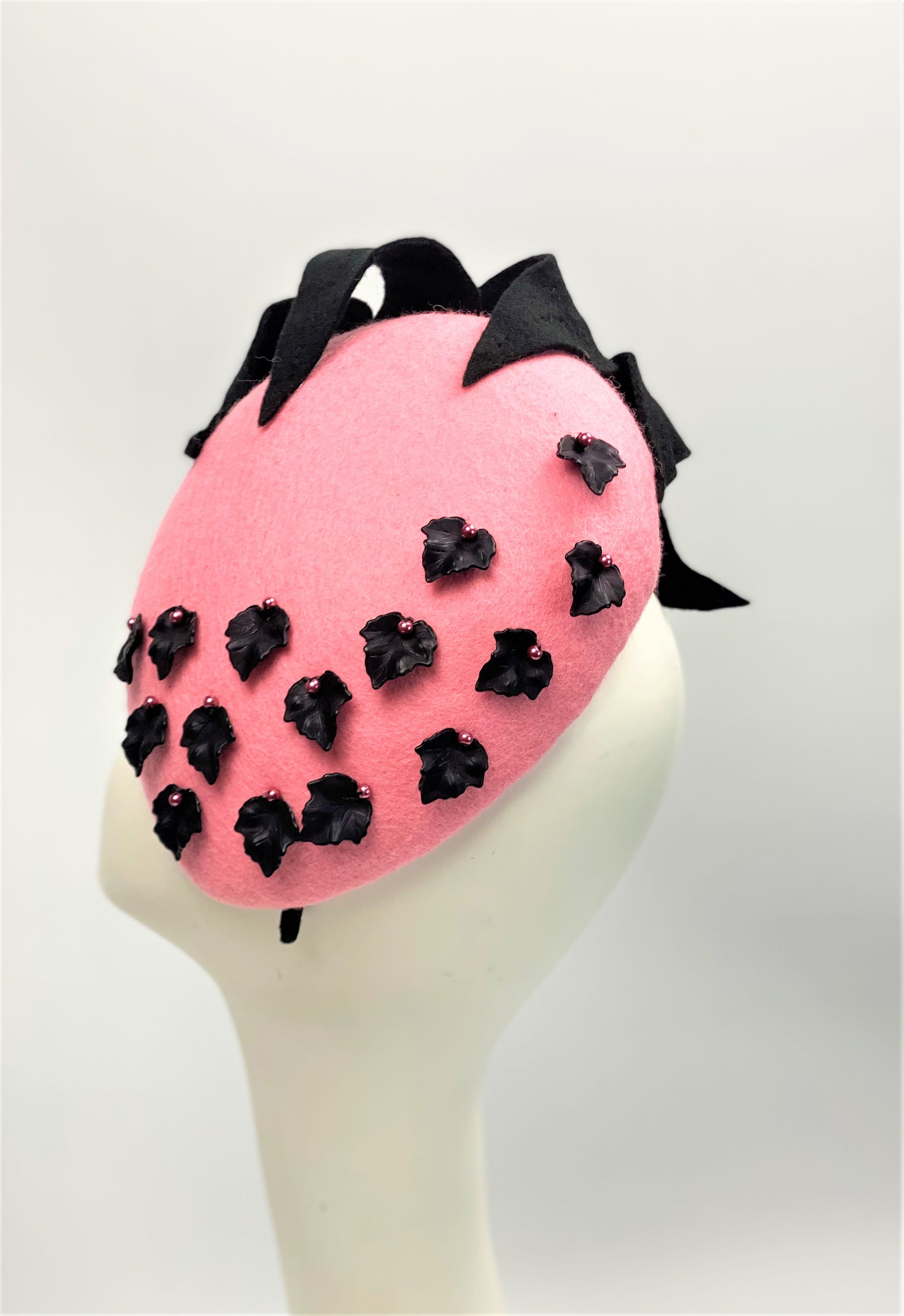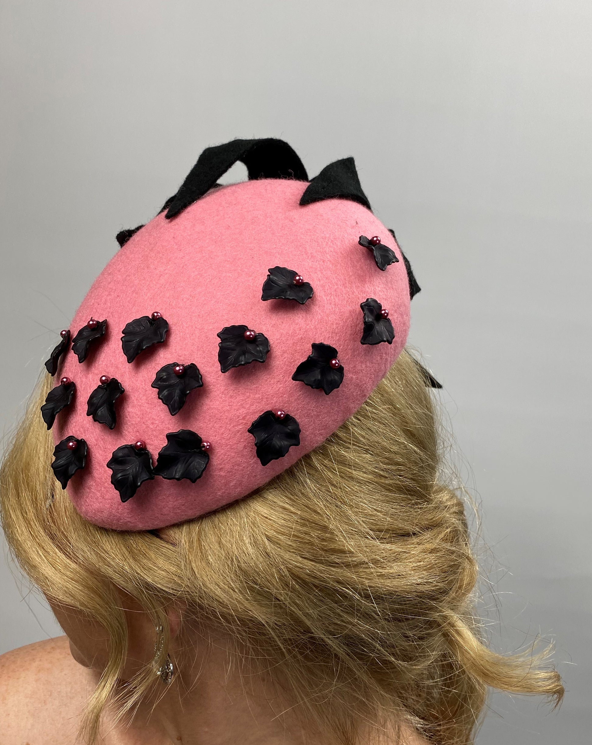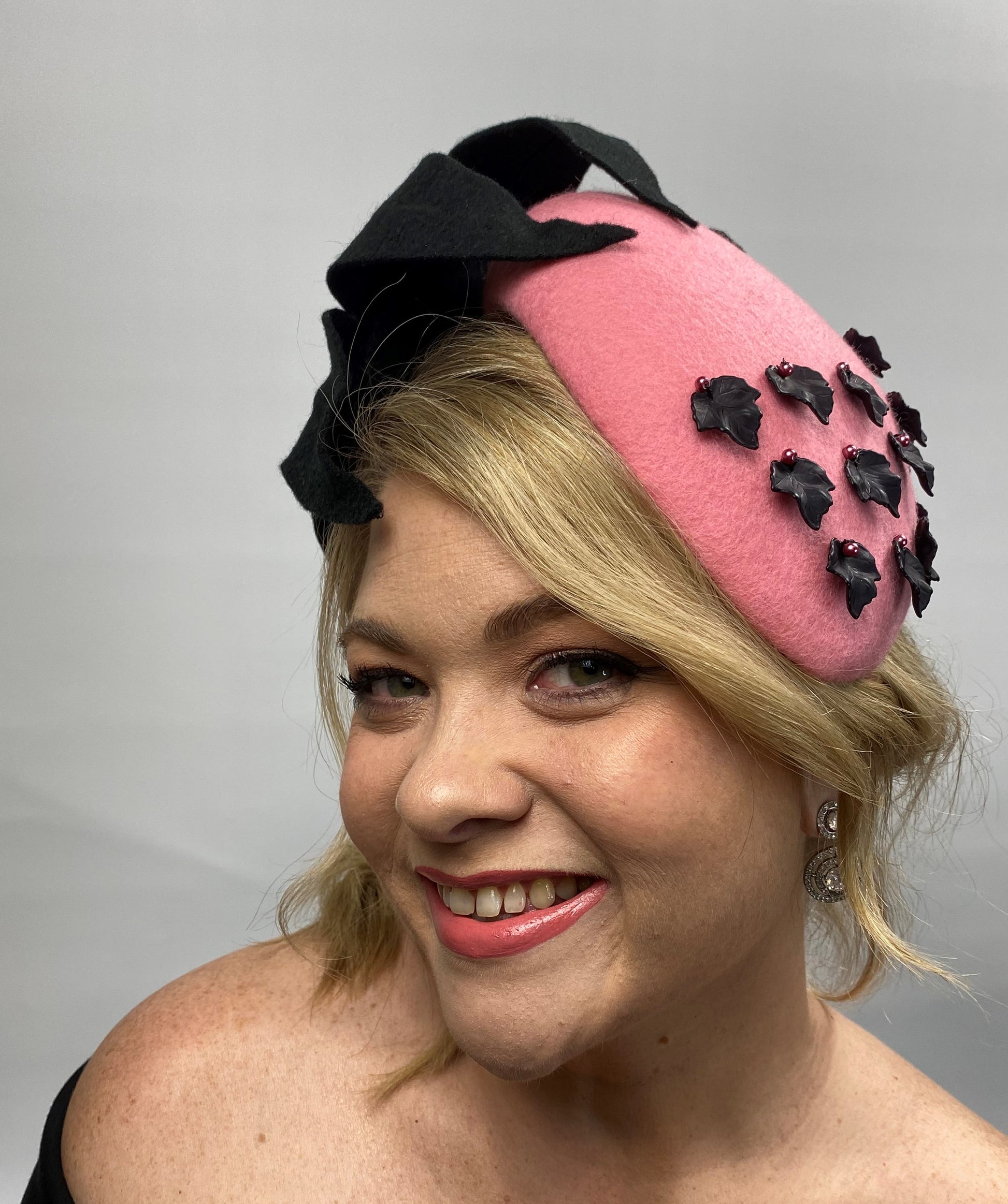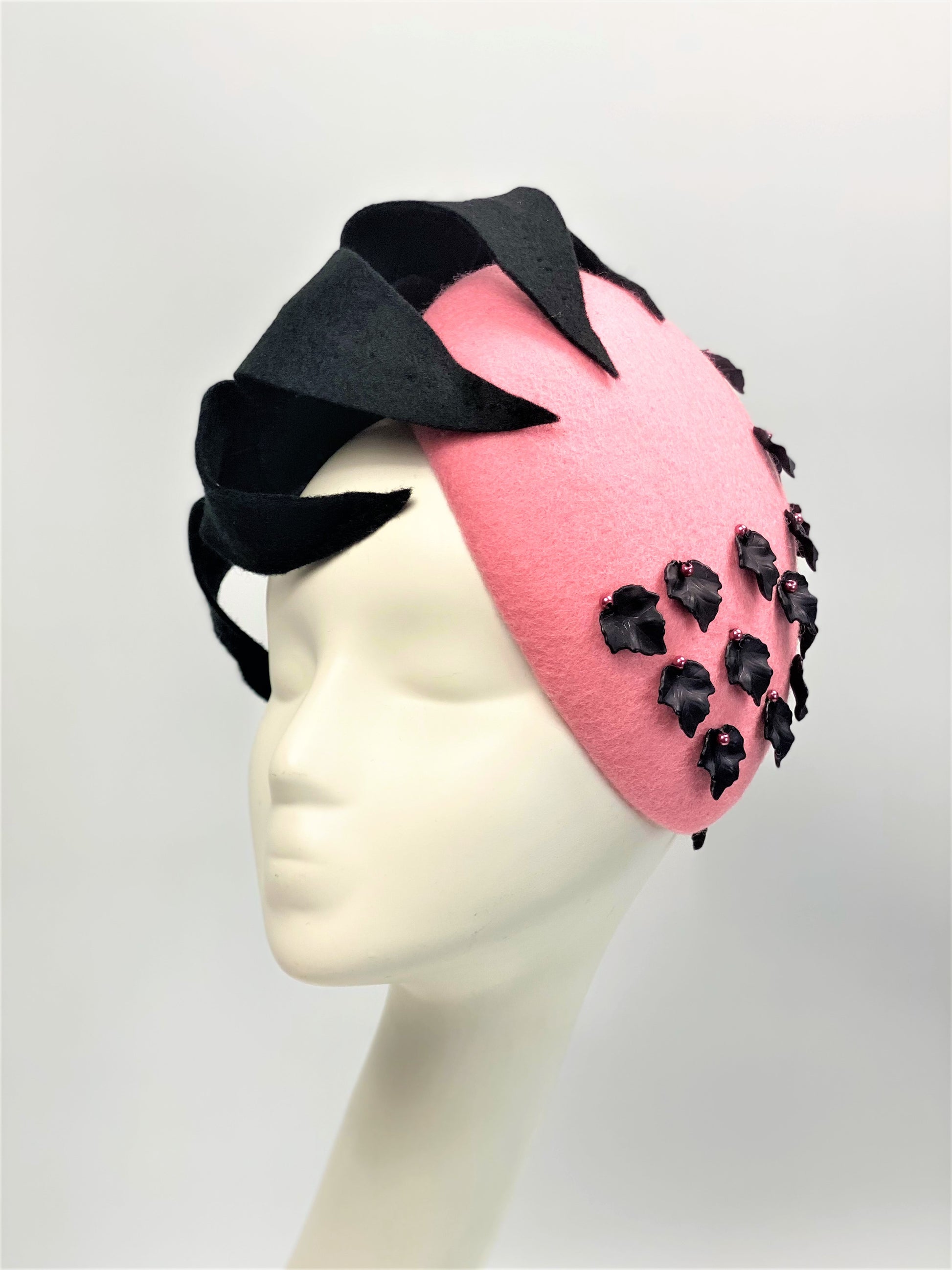 Phyliss is a Pink Felt Face Hugger with a Large Black Felt Handmade Flower and Black Beads. She is attached to a Headband and sits in place very comfortably. Very Wearable!