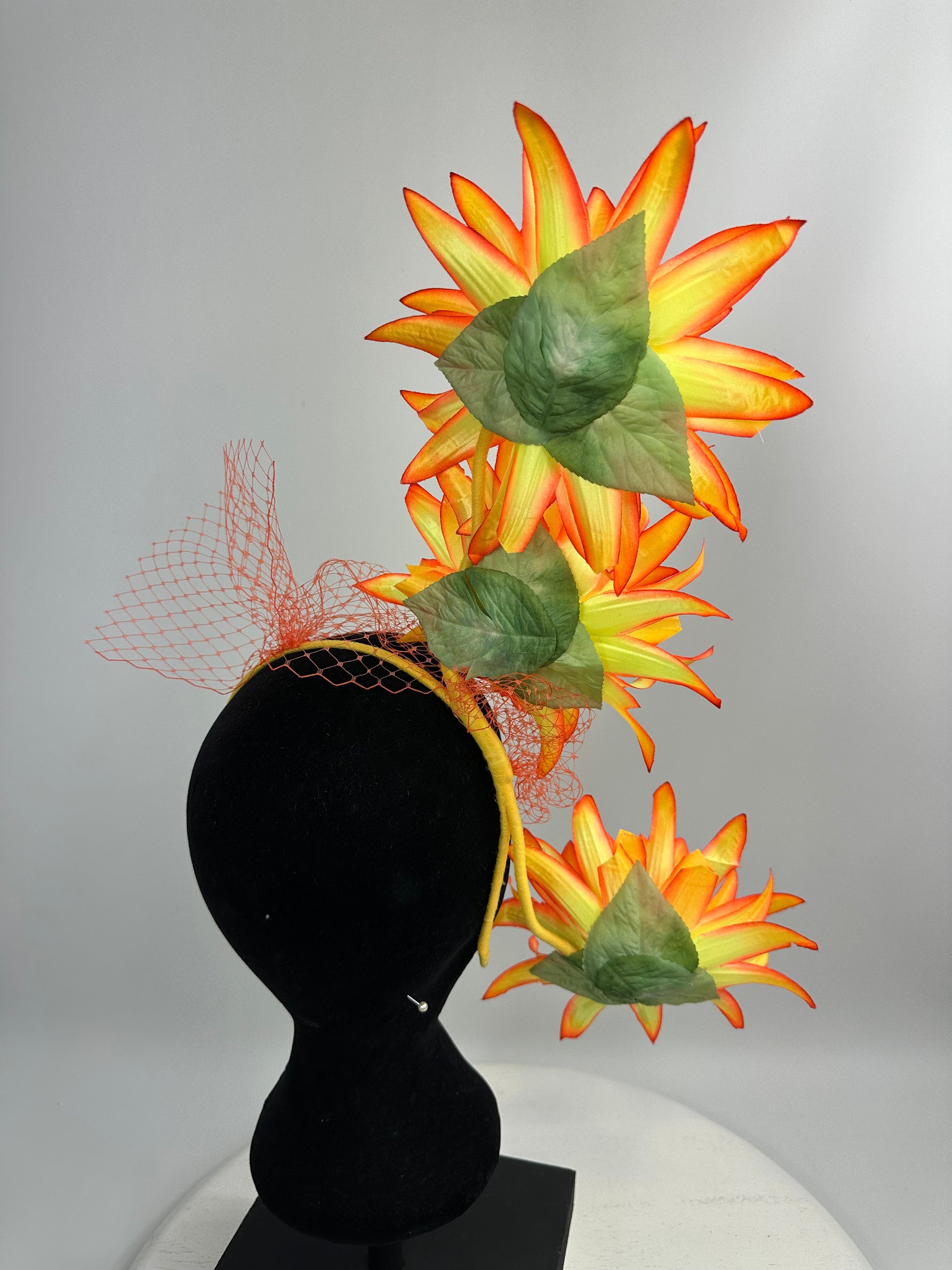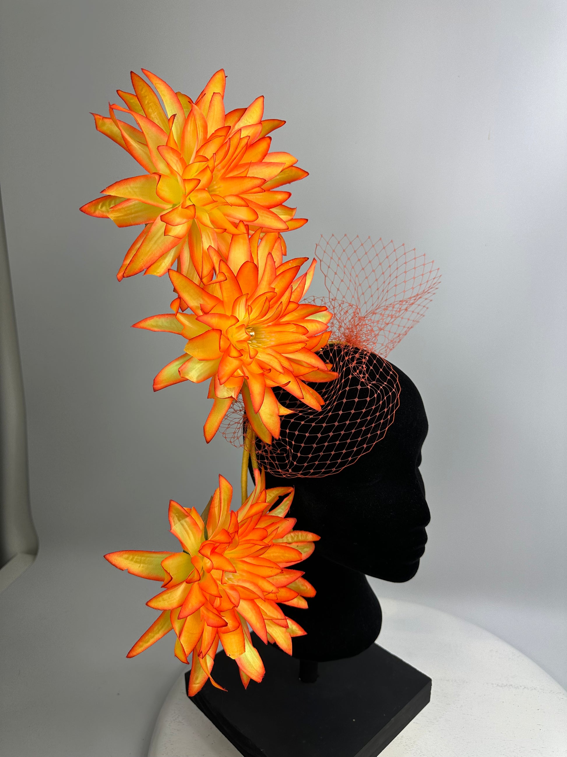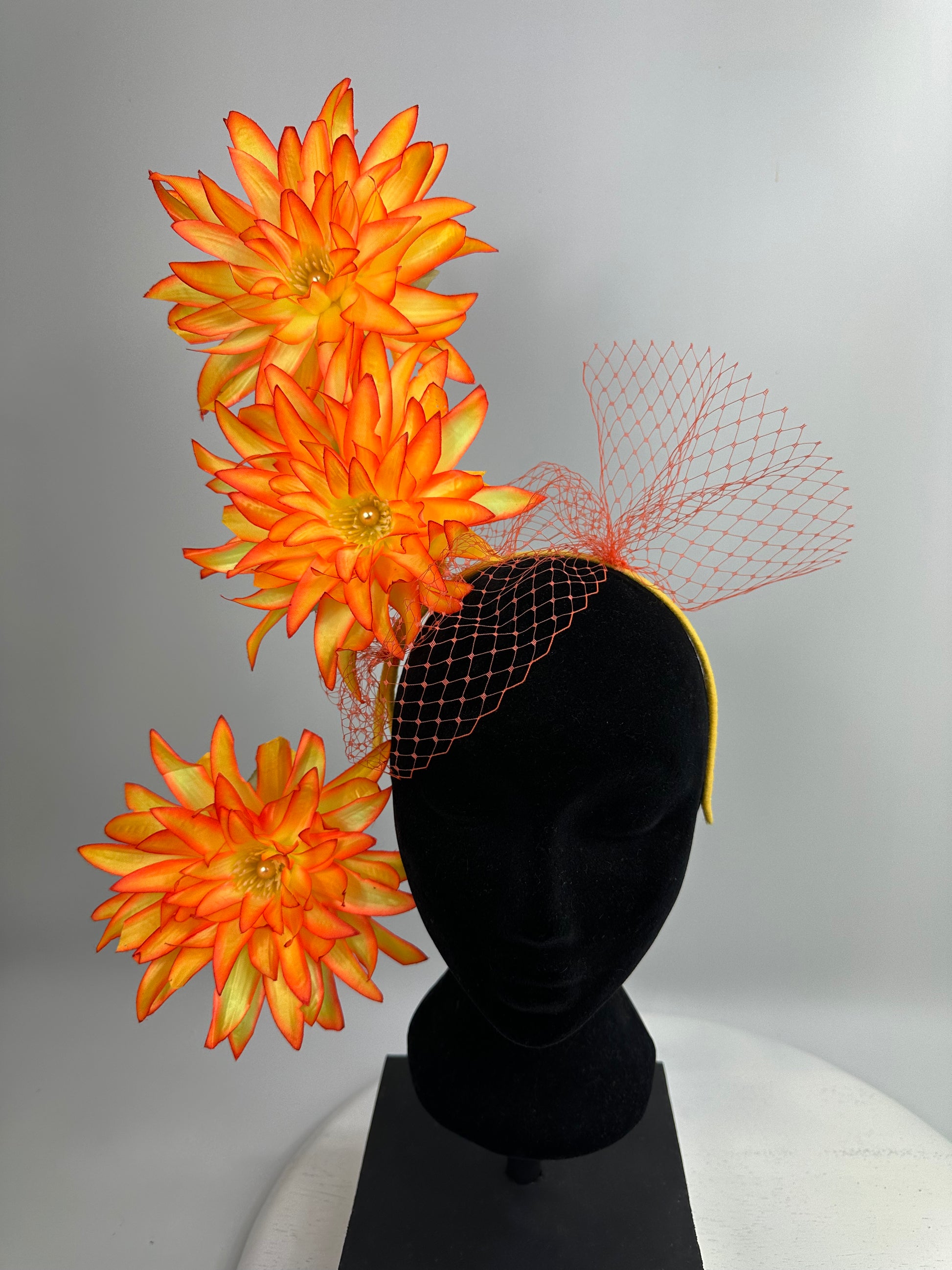The RAMONA Raceday Fascinator is bright, bold and beautiful with orange and yellow authentic vintage flower pieces, mounted onto a headband with a peep of orange veiling.